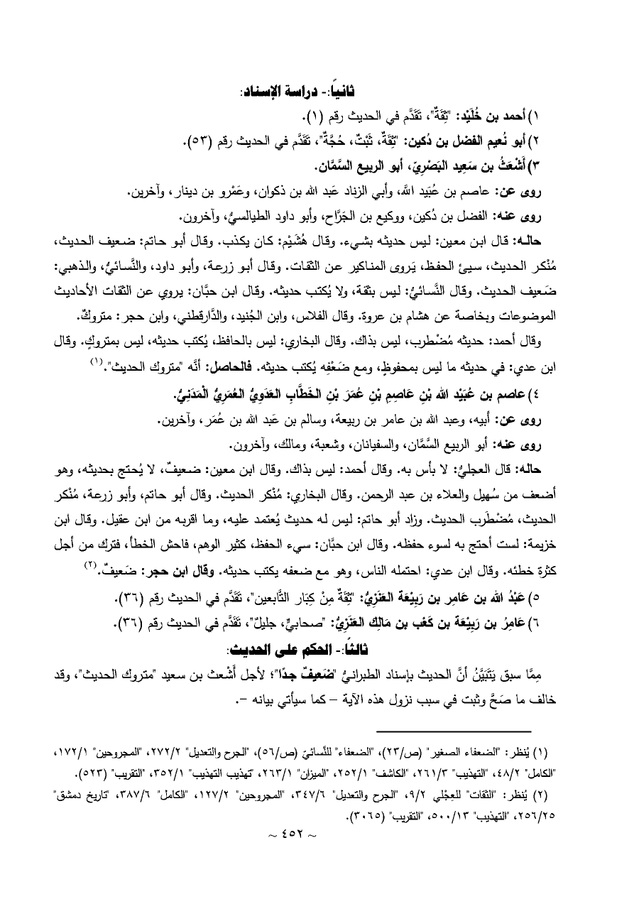 مِمَّا سبق يَتَبَيَّنُ أنَّ الحديث بإسناد الطبرانيُّ "ضَعيفٌ جدًا"؛ لأجل أَشْعث بن سعيد "متروك الحديث"، وقد خالف ما صَحَّ وثبت في سبب نزول هذه الآية - كما سيأتي بيانه -.