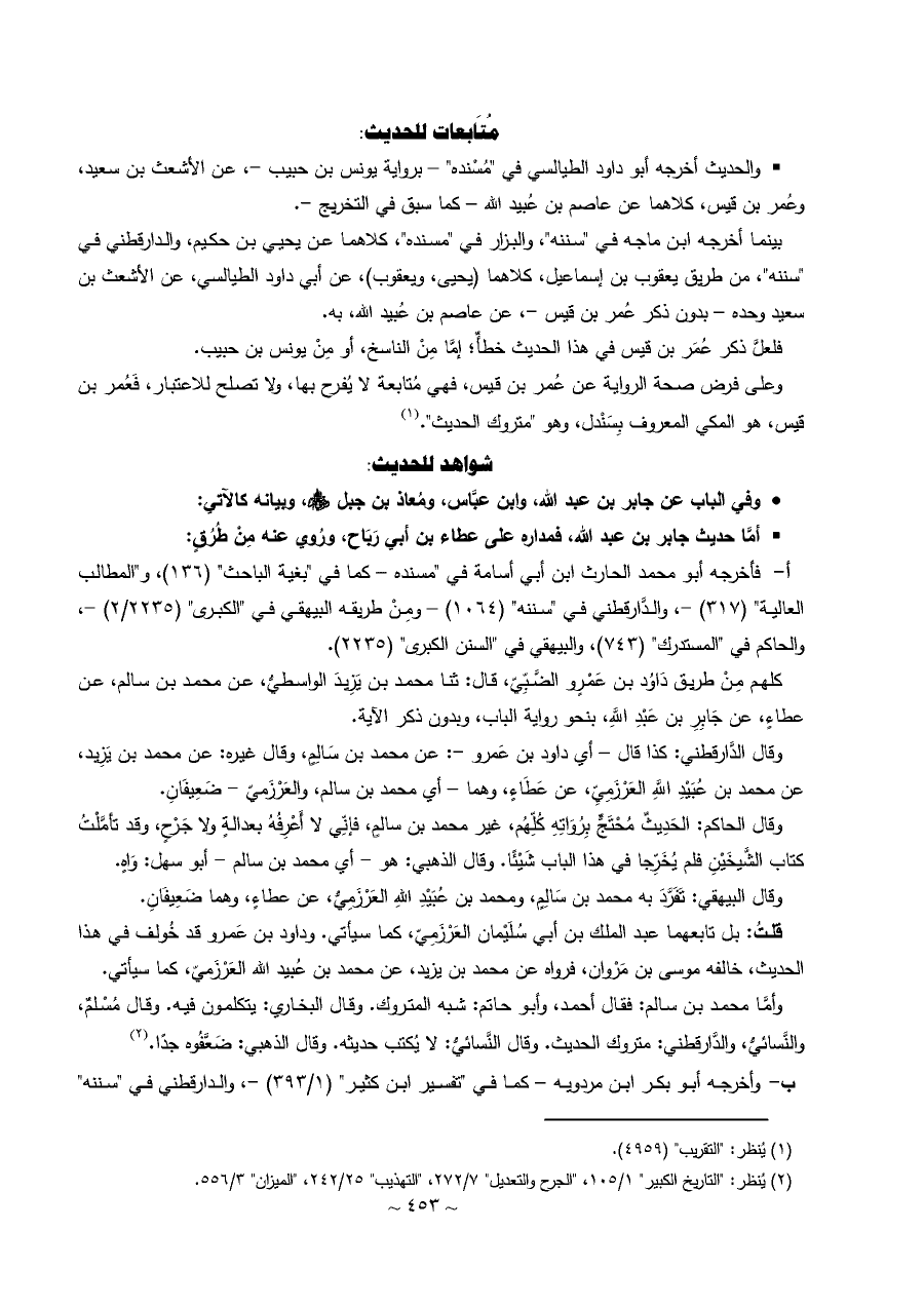 وقال الدَّارقطني: كذا قال - أي داود بن عَمرو -: عن محمد بن سَالِمٍ، وقال غيره: عن محمد بن يَزِيد، عن محمد بن عُبَيْدِ اللَّهِ العَرْزَمِيِّ، عن عَطَاءٍ، وهما - أي محمد بن سالم، والعَرْزَميّ - ضَعِيفَانِ.