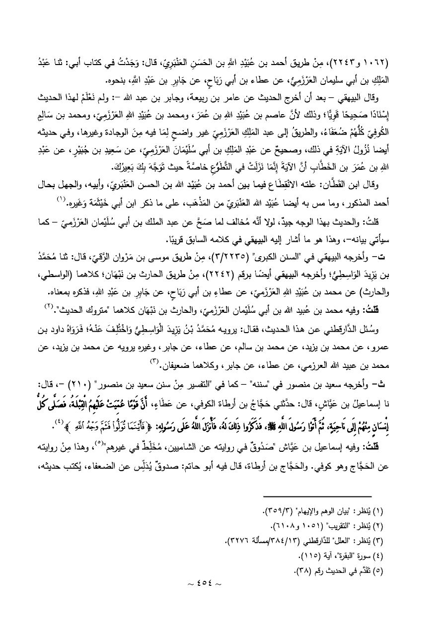 وقال البيهقي - بعد أن أخرج الحديث عن عامر بن ربيعة، وجابر بن عبد الله -: ولم نَعْلَمْ لهذا الحديث إِسْنَادًا صَحِيحًا قَوِيًّا؛ وذلك لأنَّ عاصم بن عُبَيْدِ اللهِ بن عُمَرَ، ومحمد بن عُبَيْدِ اللهِ العَرْزَمِيّ، ومحمد بن سَالِمٍ الكُوفِيّ كُلُّهُمْ ضُعَفَاءُ، والطريقُ إلى عبد المَلِكِ العَرْزَمِيِّ غير واضحٍ لِمَا فيه مِنَ الوجادة وغيرها، وفي حديثه أيضا نُزُولُ الآيَةِ في ذلك، وصحيحٌ عن عَبْدِ المَلِكِ بن أبي سُلَيْمَانَ العَرْزَمِيِّ، عن سَعِيدِ بن جُبَيْرٍ، عن عَبْدِ اللهِ بن عُمَرَ بن الخَطَّابِ أنَّ الآيَةَ إِنَّمَا نَزَلَتْ في التَّطَوُّعِ خاصَّةً حيث تَوَجَّهَ بِكَ بَعِيرُكَ.