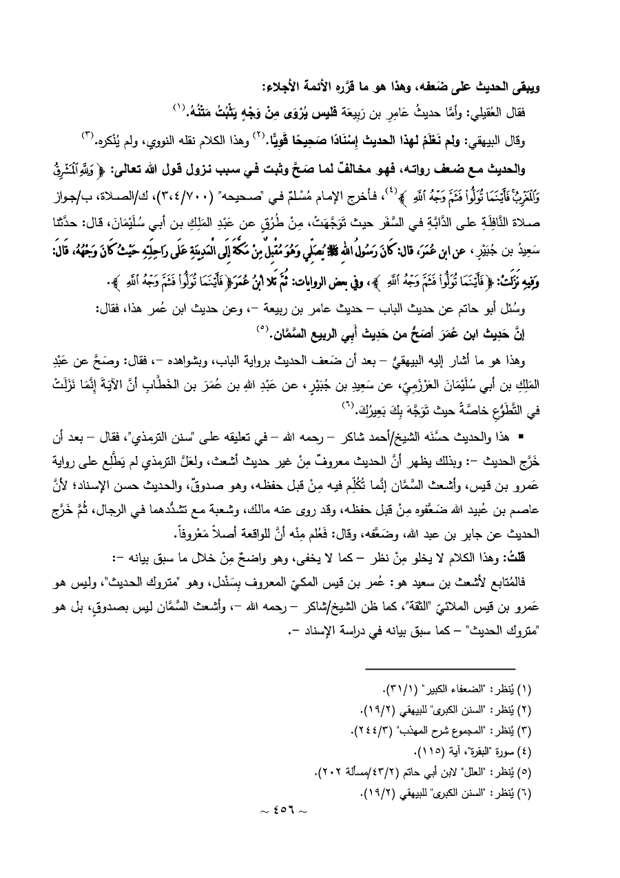 وهذا هو ما أشار إليه البيهقيُّ - بعد أن ضَعف الحديث برواية الباب، وبشواهده -، فقال: وصَحَّ عن عَبْدِ المَلِكِ بن أبي سُلَيْمَانَ العَرْزَمِيِّ، عن سَعِيدِ بن جُبَيْرٍ، عن عَبْدِ اللهِ بن عُمَرَ بن الخَطَّابِ أنَّ الآيَةَ إِنَّمَا نَزَلَتْ في التَّطَوُّعِ خاصَّةً حيث تَوَجَّهَ بِكَ بَعِيرُكَ. (¬٦)