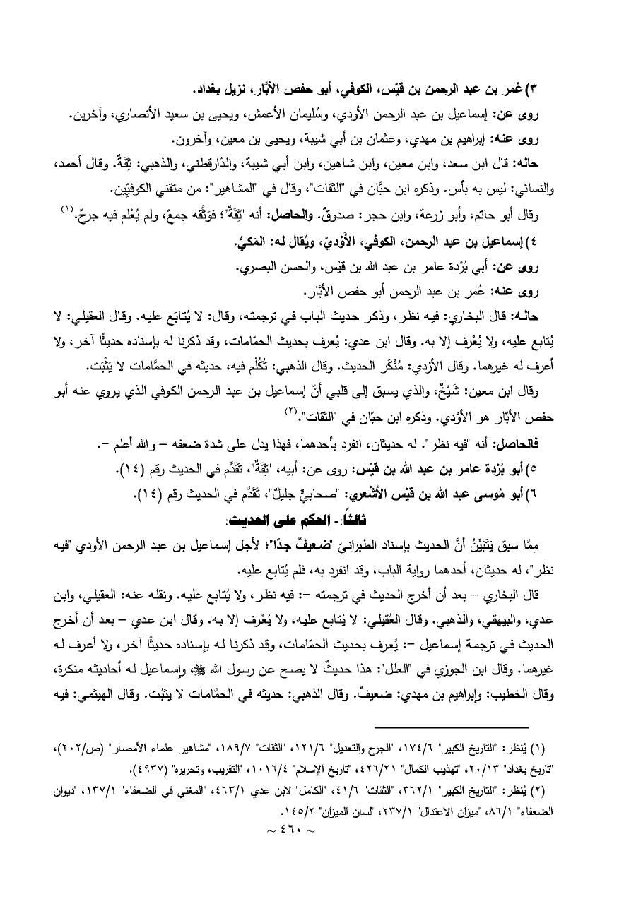 (¬٢) يُنظر: "التاريخ الكبير" ١/ ٣٦٢، "الثقات" ٦/ ٤١، "الكامل" لابن عدي ١/ ٤٦٣، "المغني في الضعفاء" ١/ ١٣٧، "ديوان الضعفاء" ١/ ٨٦، "ميزان الاعتدال" ١/ ٢٣٧، "لسان الميزان" ٢/ ١٤٥.