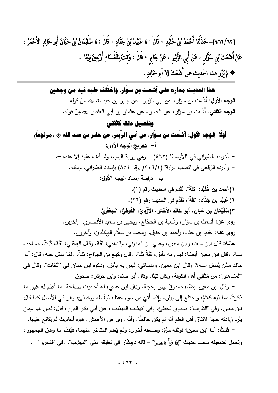 أولًا: الوجه الأول: أَشْعث بن سوّار، عن أبي الزّبير، عن جابر بن عبد الله - رضي الله عنه - (مرفوعًا).
