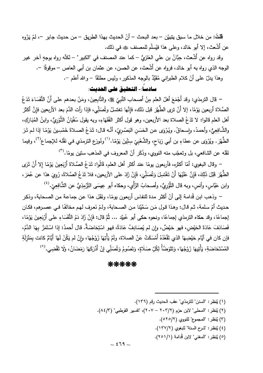 - قال الترمذي: وقد أَجْمَعَ أهلُ العلم مِنْ أصحاب النَّبِيِّ - صلى الله عليه وسلم -، والتَّابِعِينَ، ومَنْ بعدهم على أَنَّ النُّفَسَاءَ تَدَعُ الصَّلاة أربعين يَوْمًا، إلا أَنْ ترى الطُّهْرَ قبل ذلك، فإِنَّها تغتسلُ وتُصَلِّي، فإذا رأت الدَّمَ بعد الأربعين فإِنَّ أكثرَ أهل العلم قالوا: لا تَدَعُ الصلاة بعد الأربعين، وهو قول أكثر الفُقَهَاءِ، وبه يقول سُفْيَانُ الثَّوْرِيُّ، وابنُ المُبَارَكِ، والشَّافِعِيُّ، وأحمدُ، وإسحاقُ. ويُرْوَى عن الحَسَنِ البَصْرِيِّ، أنَّه قال: تَدَعُ الصلاةَ خَمْسِينَ يَوْمًا إذا لم تَرَ الطُّهْرَ. ويُرْوَى عن عطاءِ بن أبي رَبَاحٍ، والشَّعْبِيِّ سِتِّينَ يَوْمًا. (¬١) ونُوزع الترمذي في نَقْله للإجماع (¬٢)، وفيما نَقَله عن الشافعي، بل وتعجّب منه النووي، وذَكَر أنّ المعروف في المذهب ستين يومًا. (¬٣)