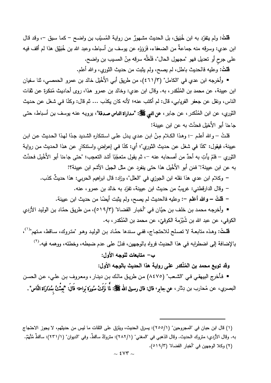 • وأخرجه ابن عدي في "الكامل" (٣/ ٤٦١)، من طريق أبي الأَخْيَل خالد بن عمرو الحمصي، ثنا سفيان ابن عيينة، عن محمد بن المُنْكدر، به. وقال ابن عدي: وخالد بن عمرو هذا، روى أحاديث مُنكرة عن ثقات الناس، ونقل عن جعفر الفريابي، قال: لم أكتب عنه؛ لأنه كان يكذب ... ثم قال: وكنّا في شغل عن حديث الثوري، عن ابن المُنْكدر، عن جابر، عن النبي - صلى الله عليه وسلم -: "مداراة الناس صدقة"، يرويه عنه يوسف بن أسباط، حتى جاءنا أبو الأَخيَل فحدَّث به عن ابن عيينة!