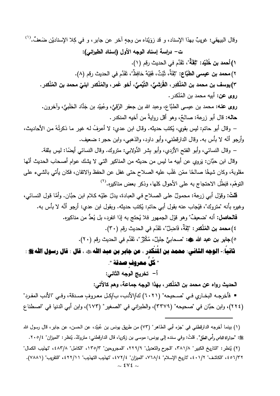 ثانيًا: - الوجه الثاني: محمد بن المُنْكدر، عن جابر بن عبد الله - رضي الله عنه -، قال: قال رسول الله - صلى الله عليه وسلم -: " كُلُّ معروفٍ صدقة ".