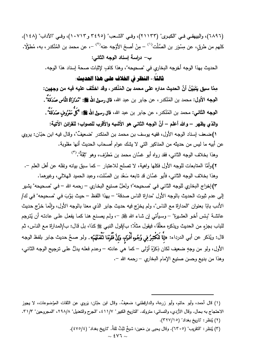 الوجه الأول: محمد بن المُنْكدر، عن جابر بن عبد الله، قال رسول الله - صلى الله عليه وسلم -: "مُدَارَاةُ النَّاس صَدَقَةٌ".