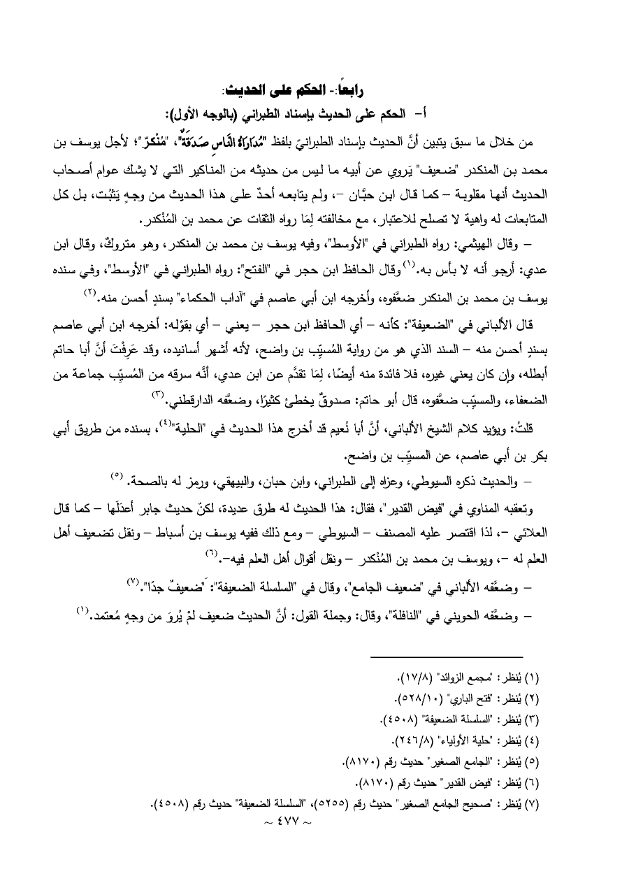 - وقال الهيثمي: رواه الطبراني في "الأوسط"، وفيه يوسف بن محمد بن المنكدر، وهو متروكٌ، وقال ابن عدي: أرجو أنه لا بأس به. (¬١) وقال الحافظ ابن حجر في "الفتح": رواه الطبراني في "الأوسط"، وفي سنده يوسف بن محمد بن المنكدر ضعَّفوه، وأخرجه ابن أبي عاصم في "آداب الحكماء" بسندٍ أحسن منه. (¬٢)