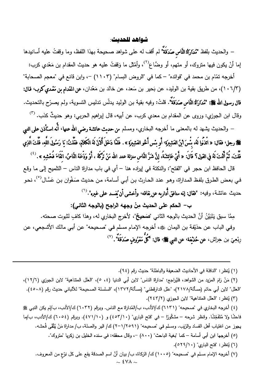 - والحديث بلفظ "مُدَارَاةُ النَّاسِ صَدَقَةٌ" لم أقف له على شواهد صحيحة بهذا اللفظ، وما وقفتُ عليه أسانيدها إما أنْ يكون فيها متروك، أو متهم، أو وضَّاع (¬١)، وأمْثل ما وَقفتُ عليه هو حديث المقدام بن مَعْدي كرب: