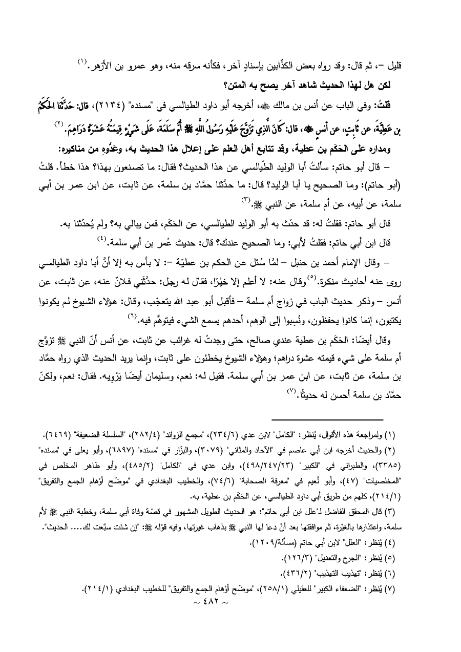 - قال أبو حاتم: سألتُ أبا الوليد الطّيالسي عن هذا الحديث؟ فقال: ما تصنعون بهذا؟ هذا خطأ. قلتُ (أبو حاتم): وما الصحيح يا أبا الوليد؟ قال: ما حدَّثنا حمَّاد بن سلمة، عن ثابت، عن ابن عمر بن أبي سلمة، عن أبيه، عن أم سلمة، عن النبي - صلى الله عليه وسلم -. (¬٣)