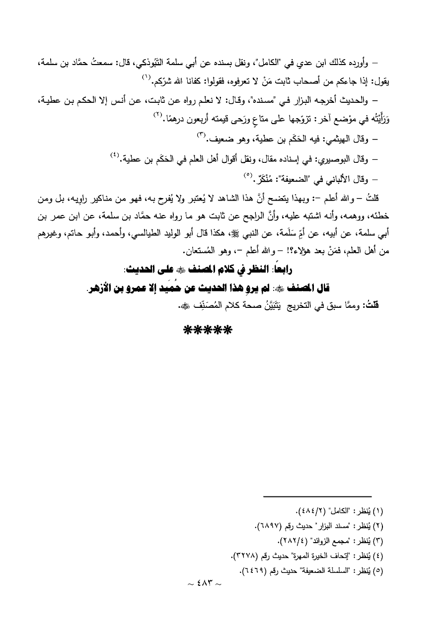 قلتُ - والله أعلم -: وبهذا يتضح أنَّ هذا الشاهد لا يُعتبر ولا يُفرح به، فهو من مناكير راوِيه، بل ومن خطئه، ووهمه، وأنه اشتبه عليه، وأنَّ الراجح عن ثابت هو ما رواه عنه حمَّاد بن سلمة، عن ابن عمر بن أبي سلمة، عن أبيه، عن أمِّ سَلَمة، عن النبي - صلى الله عليه وسلم -، هكذا قال أبو الوليد الطيالسي، وأحمد، وأبو حاتم، وغيرهم من أهل العلم، فمَنْ بعد هؤلاء؟! - والله أعلم -، وهو المُستعان.