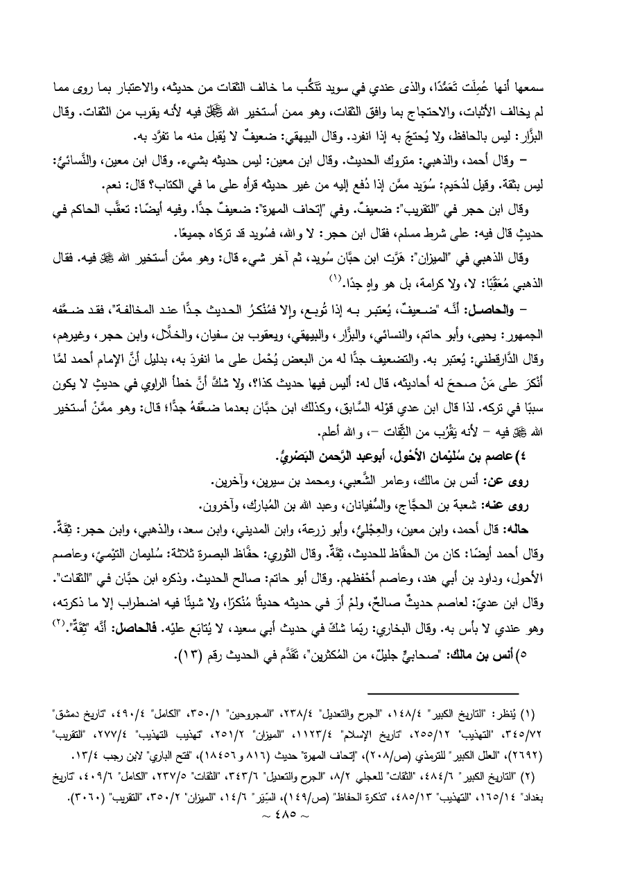 وقال ابن حجر في "التقريب": ضعيفٌ. وفي "إتحاف المهرة": ضعيفٌ جدًّا. وفيه أيضًا: تعقَّب الحاكم في حديثٍ قال فيه: على شرط مسلم، فقال ابن حجر: لا والله، فسُويد قد تركاه جميعًا.