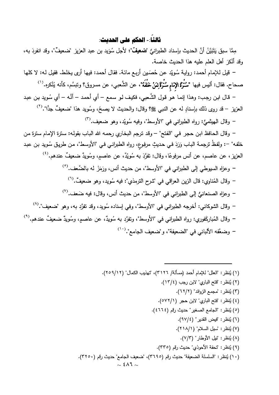- وقال الحافظ ابن حجر في "الفتح" - وقد ترجم البخاري رحمه الله الباب بقوله: سترة الإمام سترة من خلفه" -: ولفظُ ترجمة الباب وَرَدَ في حديثٍ مرفوعٍ، رواه الطبراني في "الأوسط"، من طريق سُويد بن عبد العزيز، عن عاصم، عن أنس مرفوعًا، وقال: تفرَّدَ به سُويْدٌ، عن عاصمٍ، وسُويدٌ ضعيفٌ عندهم. (¬٤)