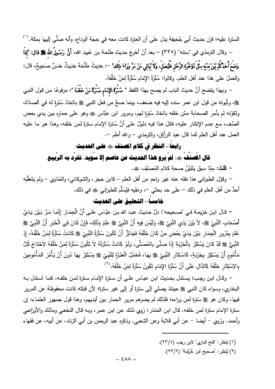 - وقال الترمذي في "سننه" (٣٣٥) - بعد أنْ أخرجَ حديث طلحة بن عُبيد الله، أنَّ رَسُولُ اللهِ - صلى الله عليه وسلم - قال: "إِذَا وَضَعَ أَحَدُكُمْ بَيْنَ يَدَيْهِ مِثْلَ مُؤَخَّرَةِ الرَّحْلِ فَلْيُصَلِّ، وَلَا يُبَالِي مَنْ مَرَّ وَرَاءَ ذَلِك" -: حَدِيثُ طَلْحَةَ حَدِيثٌ حَسَنٌ صَحِيحٌ، قال: والعملُ على هذا عند أهل العلم. وقالوا: سُتْرَةُ الإِمَامِ سُتْرَةٌ لِمَنْ خَلْفَهُ.