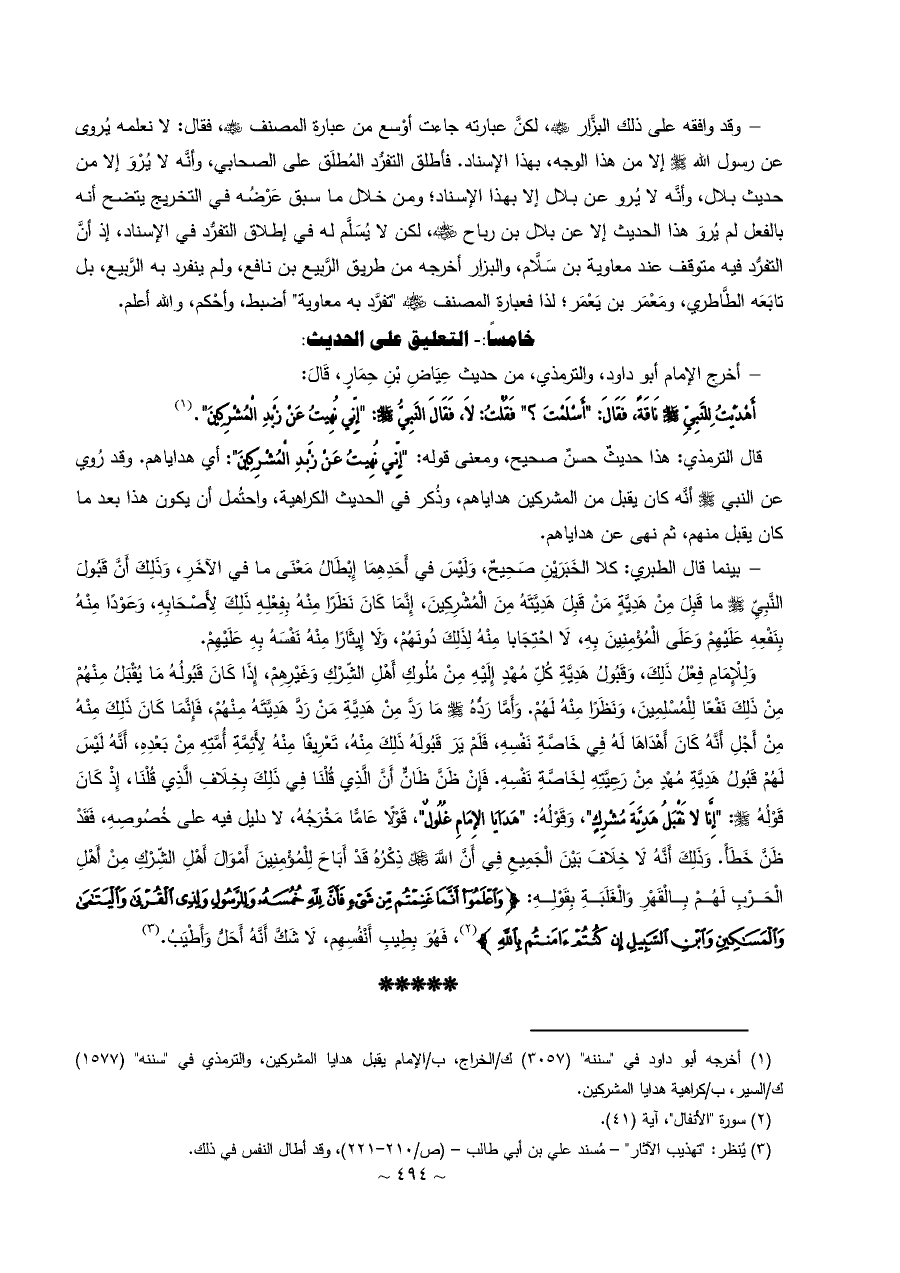 (¬١) أخرجه أبو داود في "سننه" (٣٠٥٧) ك/الخراج، ب/الإمام يقبل هدايا المشركين، والترمذي في "سننه" (١٥٧٧) ك/السير، ب/كراهية هدايا المشركين.