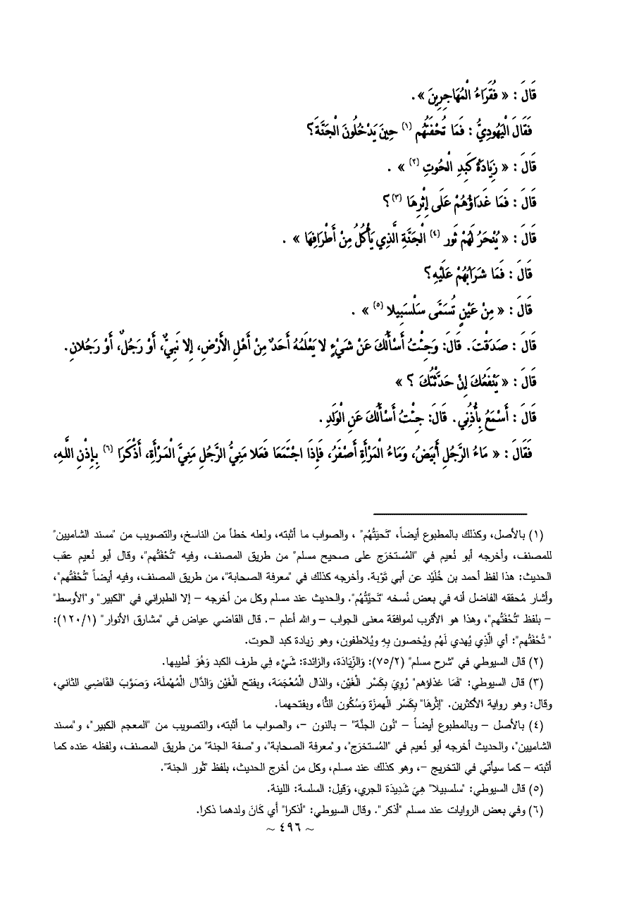 (¬١) بالأصل، وكذلك بالمطبوع أيضاً، "تَحيَتُهُم"، والصواب ما أثبته، ولعله خطأ من الناسخ، والتصويب من "مسند الشاميين" للمصنف، وأخرجه أبو نُعيم في "المُستخرَج على صحيح مسلم" من طريق المصنف، وفيه "تُحْفَتُهم"، وقال أبو نُعيم عقب الحديث: هذا لفظ أحمد بن خُلَيْد عن أبي تَوْبة. وأخرجه كذلك في "معرفة الصحابة"، من طريق المصنف، وفيه أيضاً "تُحْفَتُهم"، وأشار مُحققه الفاضل أنه في بعض نُسخه "تَحيَّتُهُم". والحديث عند مسلم وكل من أخرجه - إلا الطبراني في "الكبير" و"الأوسط" - بلفظ "تُحْفَتُهم"، وهذا هو الأقرب لموافقة معنى الجواب - والله أعلم -. قال القاضي عياض في "مشارق الأنوار" (١/ ١٢٠): " تُحْفَتُهم": أي الَّذِي يُهدي لَهُم ويُخصون بِهِ ويُلاطفون، وهو زيادة كبد الحوت.