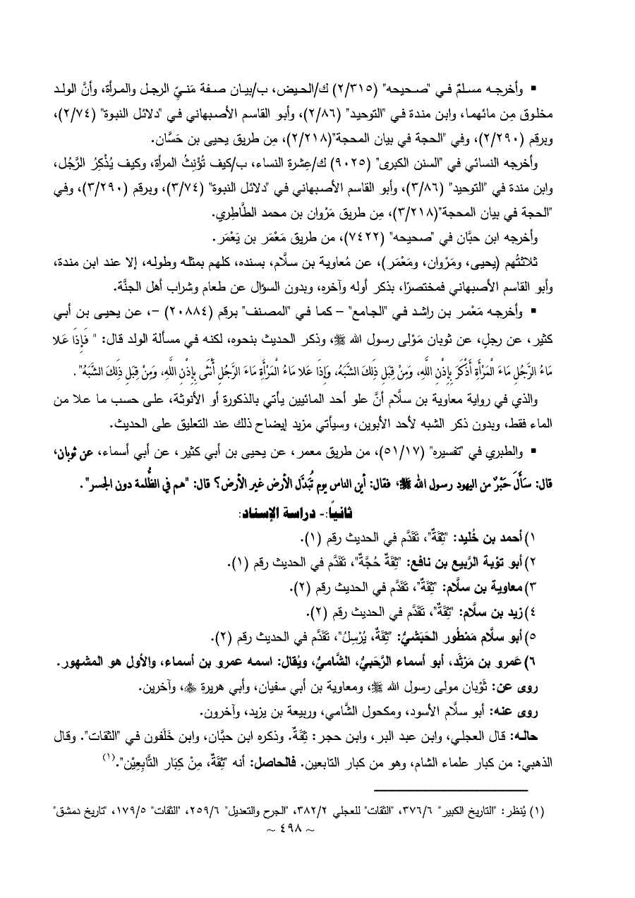 • وأخرجه مَعْمر بن راشد في "الجامع" - كما في "المصنف" برقم (٢٠٨٨٤) -، عن يحيى بن أبي كثير، عن رجلٍ، عن ثوبان مَوْلى رسول الله - صلى الله عليه وسلم -، وذكر الحديث بنحوه، لكنه في مسألة الولد قال: " فَإِذَا عَلا مَاءُ الرَّجُلِ مَاءَ الْمَرْأَةِ أَذْكَرَ بِإِذْنِ اللَّهِ، وَمِنْ قِبَلِ ذَلِكَ الشَّبَهُ، وَإِذَا عَلا مَاءُ الْمَرْأَةِ مَاءَ الرَّجُلِ أَنْثَى بِإِذْنِ اللَّهِ، وَمِنْ قِبَلِ ذَلِكَ الشَّبَهُ".