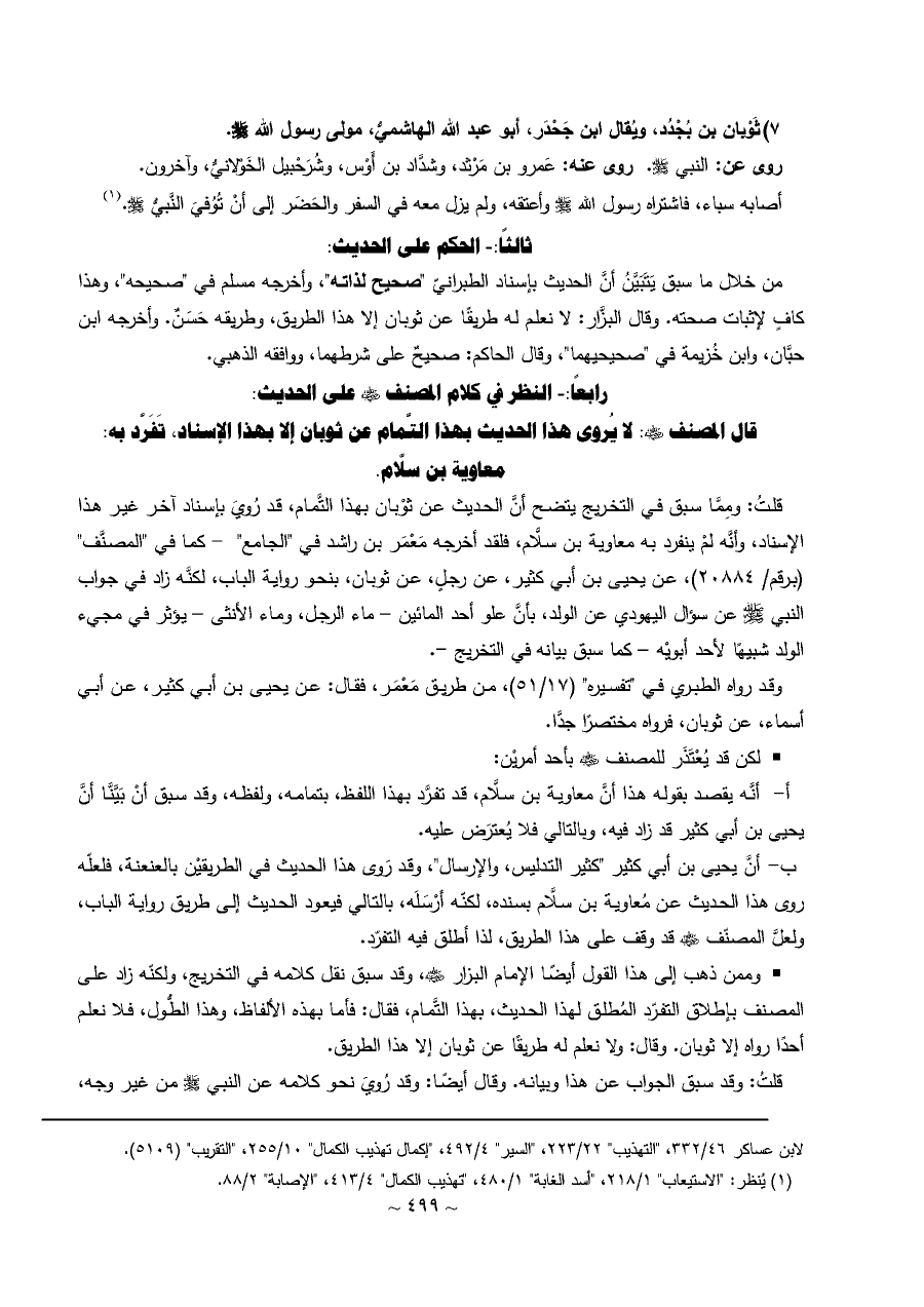 • وممن ذهب إلى هذا القول أيضًا الإمام البزار - رضي الله عنه -، وقد سبق نقل كلامه في التخريج، ولكنّه زاد على المصنف بإطلاق التفرّد المُطلق لهذا الحديث، بهذا التَّمام، فقال: فأما بهذه الألفاظ، وهذا الطُّول، فلا نعلم أحدًا رواه إلا ثوبان. وقال: ولا نعلم له طريقًا عن ثوبان إلا هذا الطريق.