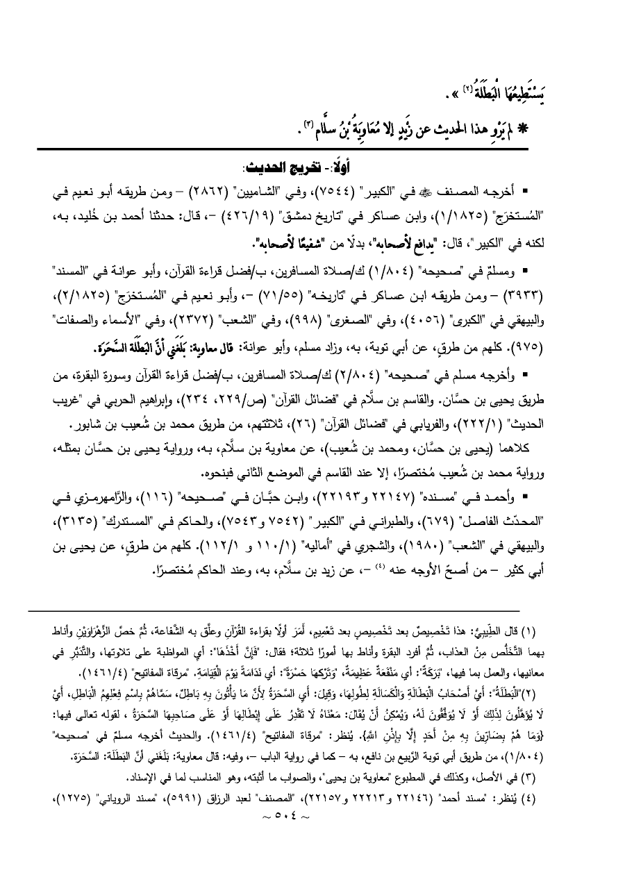 (¬١) "الْبَطَلَةُ": أَيْ أَصْحَابُ الْبَطَالَةِ وَالْكَسَالَةِ لِطُولِهَا، وَقِيلَ: أَيِ السَّحَرَةُ لِأَنَّ مَا يَأْتُونَ بِهِ بَاطِلٌ، سَمَّاهُمْ بِاسْمِ فِعْلِهِمُ الْبَاطِلِ، أَيْ لَا يُؤَهَّلُونَ لِذَلِكَ أَوْ لَا يُوَفَّقُونَ لَهُ، وَيُمْكِنُ أَنْ يُقَالَ: مَعْنَاهُ لَا تَقْدِرُ عَلَى إِبْطَالِهَا أَوْ عَلَى صَاحِبِهَا السَّحَرَةُ، لقوله تعالى فيها: {وَمَا هُمْ بِضَارِّينَ بِهِ مِنْ أَحَدٍ إِلَّا بِإِذْنِ اللَّهِ}. يُنظر: "مرقاة المفاتيح" (٤/ ١٤٦١). والحديث أخرجه مسلمٌ في "صحيحه" (٨٠٤/ ١)، من طريق أبي توبة الرَّبيع بن نافع، به - كما في رواية الباب -، وفيه: قال معاوية: بَلَغَني أنَّ البَطَلَة: السَّحَرَة.