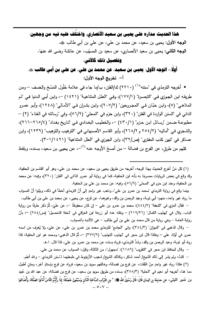 (¬١) كل مَنْ أخرج الحديث بهذا الوجه، أخرجه من طريق يحيى بن سعيد، عن محمد بن علي، وهو أبو القاسم بن الحنفية، وقد وقع في بعض الروايات مصرحًا به بأنه ابن الحنفية، كما في رواية أبو عمرو الدّاني في "الفتن" (٣٢٠)، وفيه: عن محمد بن الحنفية، وعند ابن حزم في "المحلى" (٩/ ٥٦)، وفيه: عن محمد بن علي بن الحنفية.