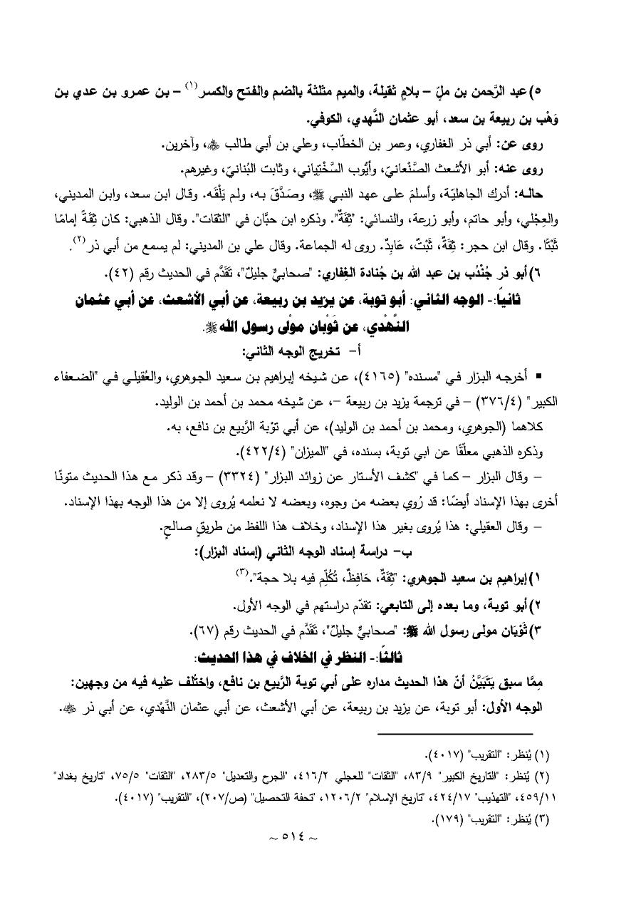 ثانيًا: - الوجه الثاني: أبو توبة، عن يزيد بن ربيعة، عن أبي الأشعث، عن أبي عثمان النَّهْدي، عن ثَوْبان موْلى رسول الله - صلى الله عليه وسلم -.