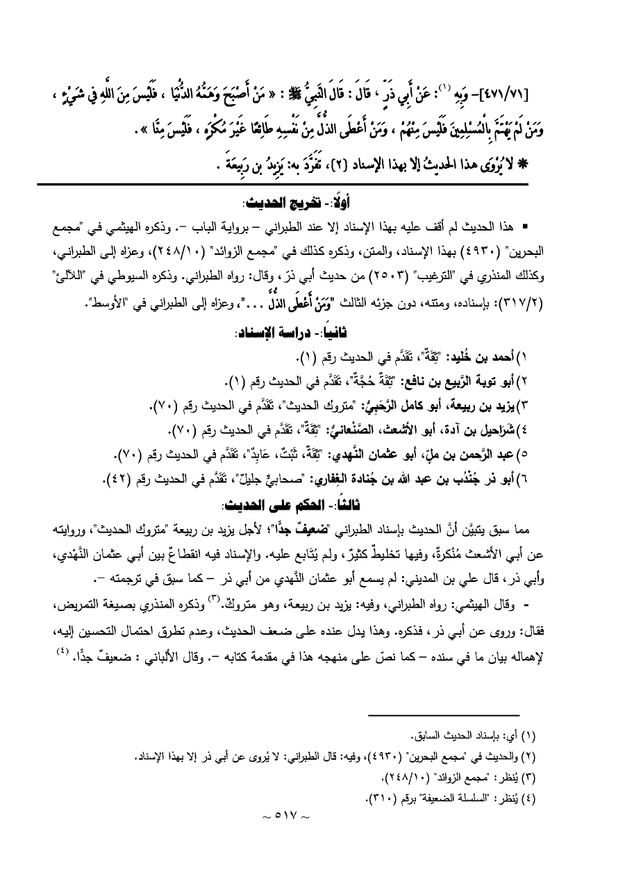 - وقال الهيثمي: رواه الطبراني، وفيه: يزيد بن ربيعة، وهو متروكٌ. (¬٣) وذكره المنذري بصيغة التمريض، فقال: وروى عن أبي ذر، فذكره. وهذا يدل عنده على ضعف الحديث، وعدم تطرق احتمال التحسين إليه، لإهماله بيان ما في سنده - كما نصّ على منهجه هذا في مقدمة كتابه -. وقال الألباني: ضعيفٌ جدًّا. (¬٤)
