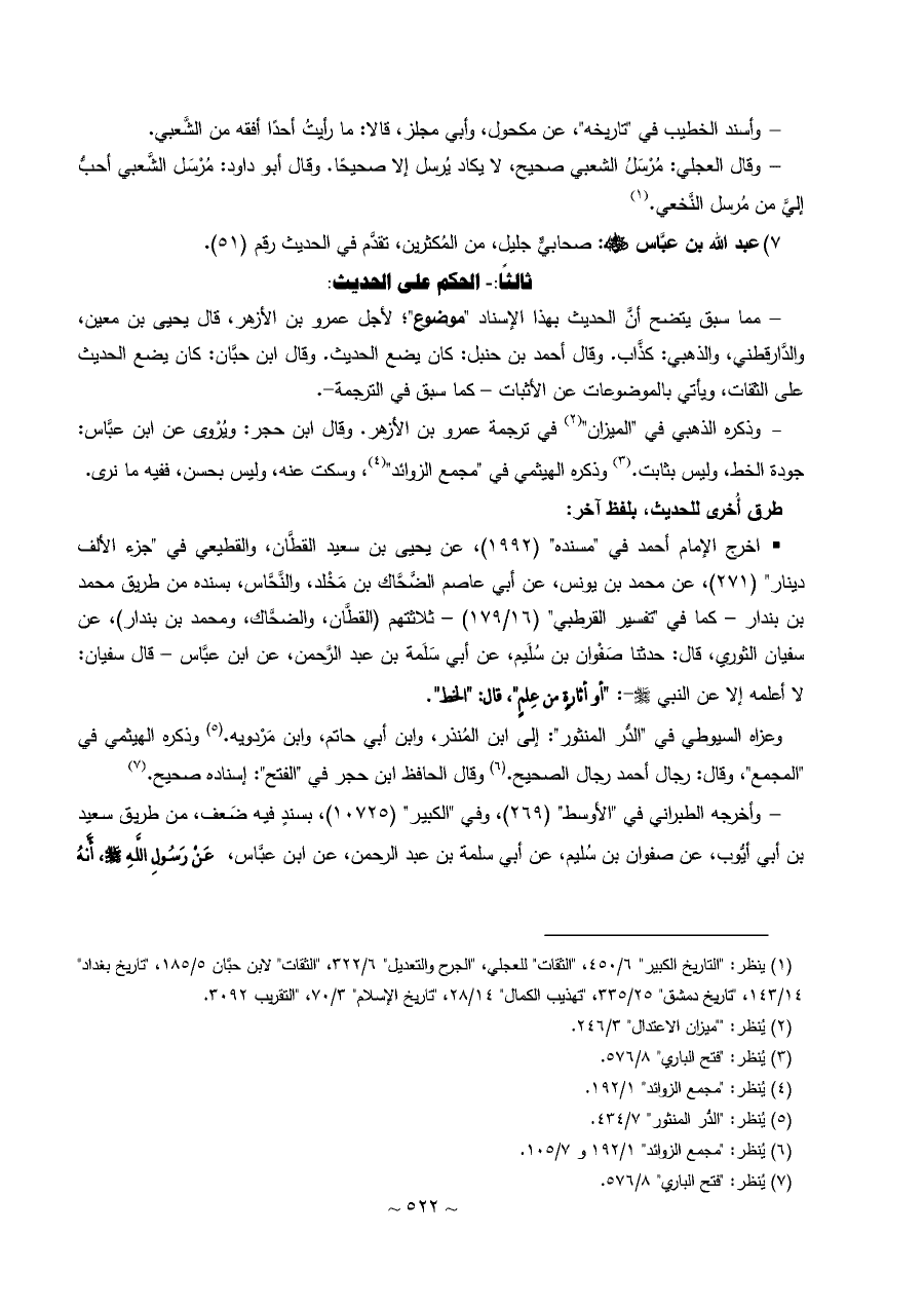 - وذكره الذهبي في "الميزان" (¬٢) في ترجمة عمرو بن الأزهر. وقال ابن حجر: ويُرْوى عن ابن عبَّاس: جودة الخط، وليس بثابت. (¬٣) وذكره الهيثمي في "مجمع الزوائد" (¬٤)، وسكت عنه، وليس بحسن، ففيه ما نرى.