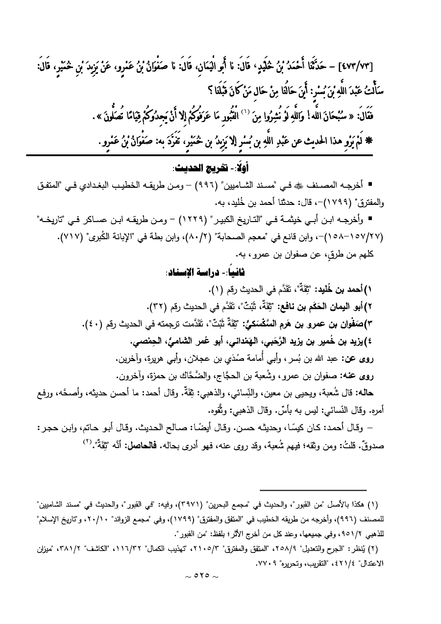 [٧٣/ ٤٧٣]- حَدَّثَنَا أَحْمَدُ بْنُ خُلَيْدٍ، قَالَ: نا أَبُو الْيَمَانِ، قَالَ: نا صَفْوَانُ بْنُ عَمْرٍو، عَنْ يَزِيدَ بْنِ خُمَيْرٍ، قَالَ: سَأَلْتُ عَبْدَ اللَّهِ بْنَ بُسْرٍ: أَيْنَ حَالُنَا مِنْ حَالِ مَنْ كَانَ قَبْلَنَا؟