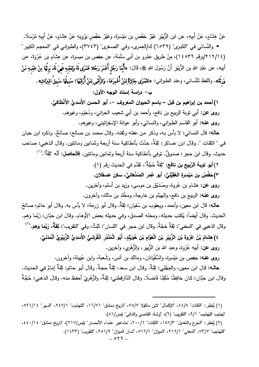 • والنَّسائي في "الكبرى" (٦٥٣٩) ك/العمرى، وفي "الصغرى" (٣٧٤٣)، والطبراني في "المعجم الكبير" (١٤/ ٢١٢/برقم ١٤٨٣٩)، مِنْ طريق عَمْرو بن أبي سَلَمَة، عن حفص بن ميسرة، عن هِشَامِ بن عُرْوَةَ، عن أبيه، عن عَبْدِ اللهِ بن الزُّبَيْرِ أَنَّ رَسُولَ اللهِ - صلى الله عليه وسلم -، قَالَ: «أَيُّمَا رَجُلٍ أَعْمَرَ رَجُلا عُمْرَى لَهُ وَلِعَقِبِهِ فَهِيَ لَهُ، يَرِثُهَا مِنْ عَقِبِهِ مَنْ وَرِثَهُ». واللفظ للنَّسائي، وعند الطبراني: «العُمْرَى جَائِزَةٌ لِمَنْ أُعْمِرَهَا، وَالرُّقْبَى لِمَنْ أُرْقِبَهَا؛ سَبِيلُهَا سَبِيلُ المِيرَاثِ».