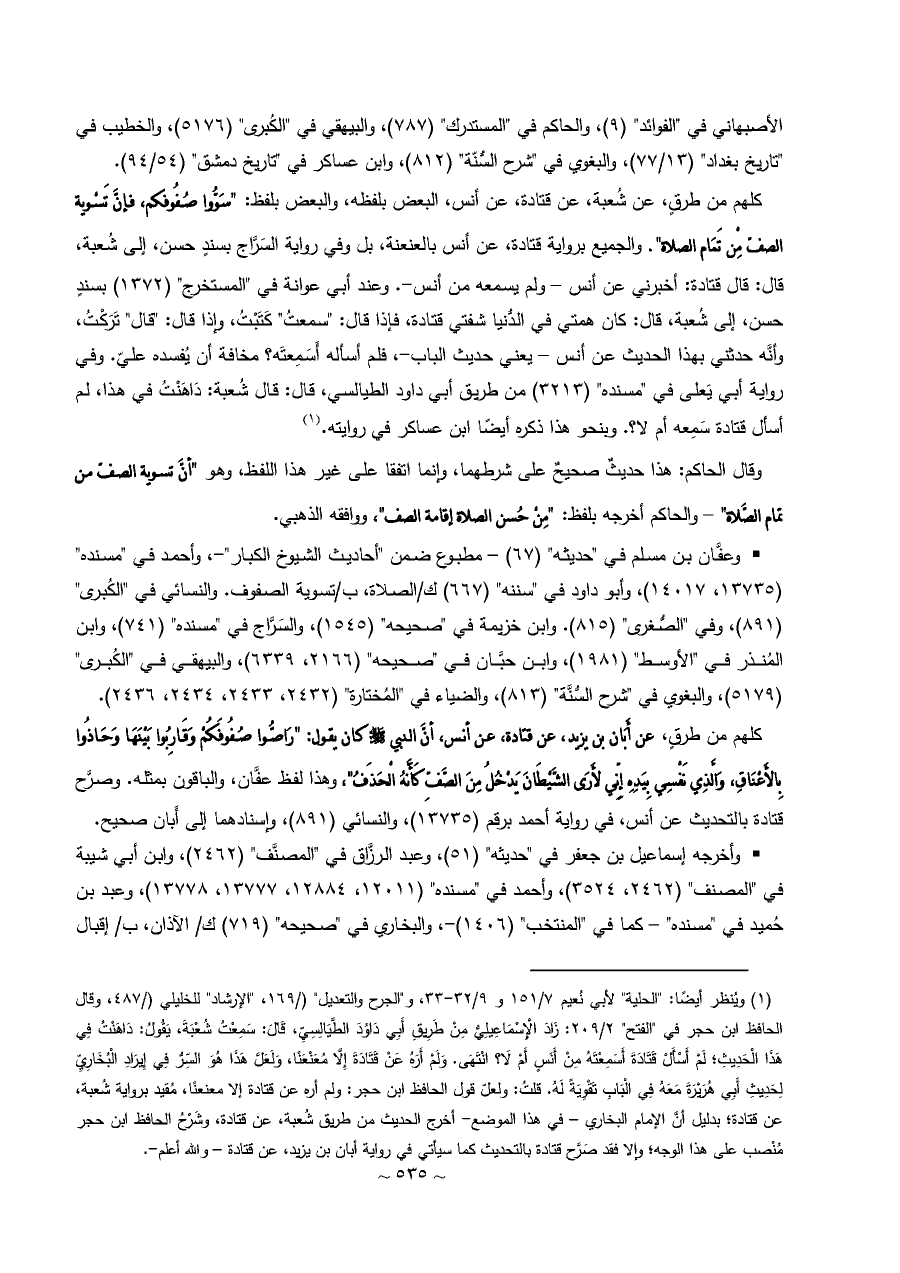 كلهم من طرقٍ، عن أَبَان بن يزيد، عن قتادة، عن أنس، أنَّ النبي - صلى الله عليه وسلم - كان يقول: "رَاصُّوا صُفُوفَكُمْ وَقَارِبُوا بَيْنَهَا وَحَاذُوا بِالأَعْنَاقِ، وَالَّذِي نَفْسِي بِيَدِهِ إِنِّي لأَرَى الشَّيْطَانَ يَدْخُلُ مِنَ الصَّفِّ كَأَنَّهُ الْحَذَفُ"، وهذا لفظ عفَّان، والباقون بمثله. وصرَّح قتادة بالتحديث عن أنس، في رواية أحمد برقم (١٣٧٣٥)، والنسائي (٨٩١)، وإسنادهما إلى أَبان صحيح.