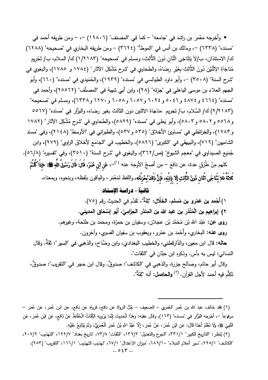 • وأخرجه مَعْمر بن راشد في "جامعه" - كما في "المصنف" (١٩٨٠٦) -، - ومن طريقه أحمد في "مسنده" (٦٣٣٨) -، ومالك بن أنس في "الموطأ" (٣٦٢٤) - ومن طريقه البخاري في "صحيحه" (٦٢٨٨) ك/ الاستئذان، ب/لَا يَتَنَاجَى اثْنَانِ دُونَ الثَّالِثِ، ومسلم في "صحيحه" (٢١٨٣/ ١) ك/ السلام، ب/ تَحْرِيمِ مُنَاجَاةِ الِاثْنَيْنِ دُونَ الثَّالِثِ بِغَيْرِ رِضَاهُ، والطحاوي في "شرح مُشْكِل الآثار" (١٧٨٤ و ١٧٨٥)، والبغوي في "شرح السنة" (٣٥٠٨) -، وأبو داود الطيالسي في "مسنده" (١٩٣٩)، والحُمَيدي في "مسنده" (٦٦٠)، وأبو الجهم العلاء بن موسى الباهلي في "جزئه" (٢٨)، وابن أبي شيبة في "المصنَّف" (٢٥٥٦٢)، وأحمد في "مسنده" (٤٦٦٤ و ٤٨٧٤ و ٥٠٤٦ و ٦٠٢٤ و ٦٠٥٧ و ٦٠٥٨ و ٦٢٧٠ و ٦٣٣٨)، ومسلم في "صحيحه" (٢١٨٣/ ٢) ك/ السَّلام، ب/ تحريم مناجاة الاثنين دون الثالث بغير رضاه، والبزَّار في "مسنده" (٥٥٦٧ و ٥٥٦٨ و ٥٨٠٢ و ٥٨٠٣)، وأبو يَعلى في "مسنده" (٥٨٢٩)، والطحاوي في "شرح مُشْكِل الآثار" (١٧٨٢ و ١٧٨٣)، والخرائطي في "مساوئ الأخلاق" (٥٣٥ و ٥٣٧)، والطبراني في "الأوسط" (٢١٤٨)، وفي "مسند الشاميين" (٧١٩)، والبيهقي في "الكبرى" (٥٨٩٦)، والخطيب في "الجامع لأخلاق الراوي" (٢٧٩)، وابن جُمَيع الصيداوي في "معجم الشيوخ" (ص/٣٦٢)، والبغوي في "شرح السنة" (٣٥١٠)، وفي "تفسيره" (٨/ ٥٦).