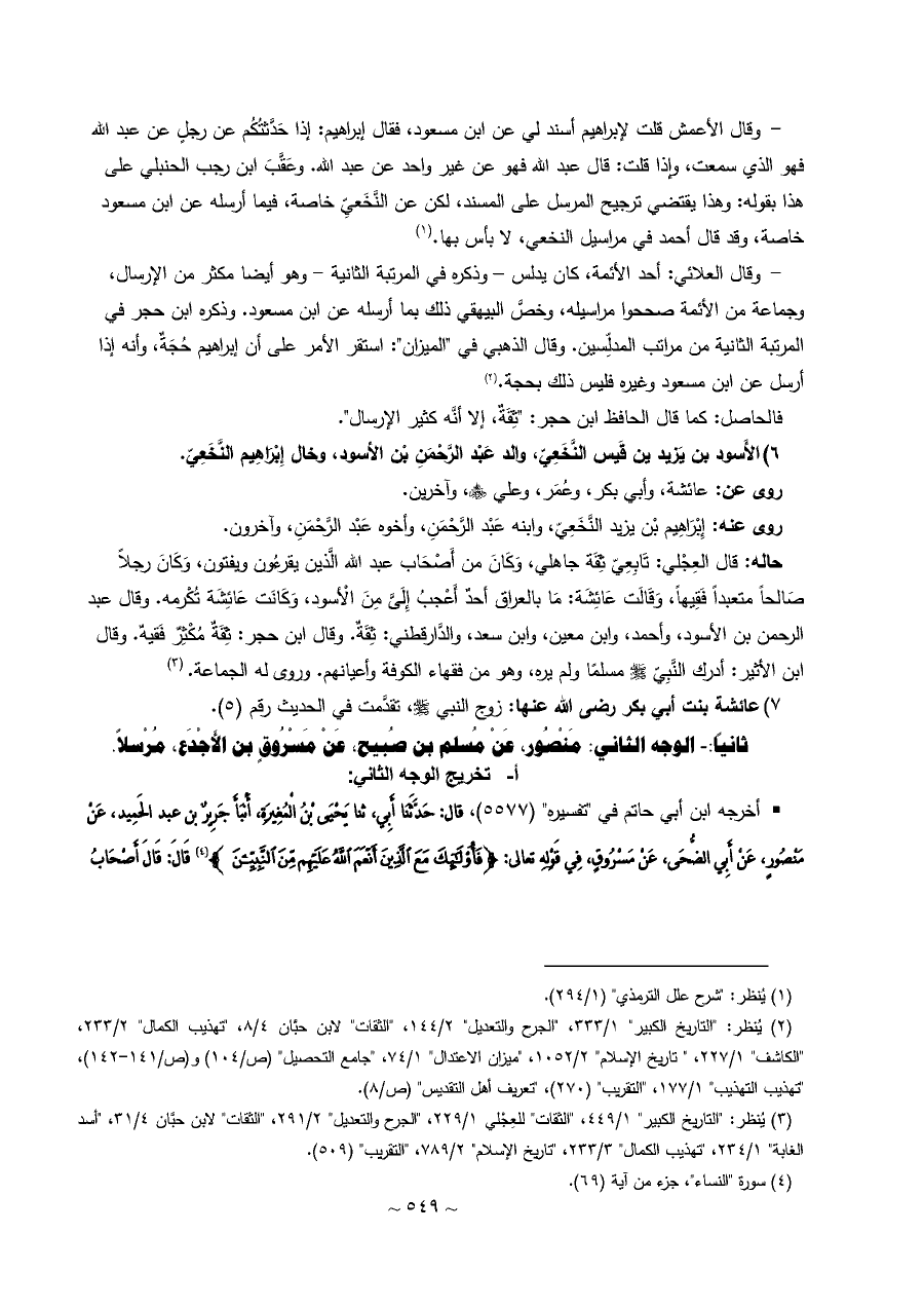- وقال العلائي: أحد الأئمة، كان يدلس - وذكره في المرتبة الثانية - وهو أيضا مكثر من الإرسال، وجماعة من الأئمة صححوا مراسيله، وخصَّ البيهقي ذلك بما أرسله عن ابن مسعود. وذكره ابن حجر في المرتبة الثانية من مراتب المدلِّسين. وقال الذهبي في "الميزان": استقر الأمر على أن إبراهيم حُجَةٌ، وأنه إذا أرسل عن ابن مسعود وغيره فليس ذلك بحجة. (¬٢)