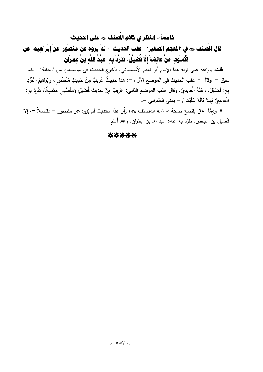 • ومِمَّا سبق يتضح صحة ما قاله المصنف - رضي الله عنه -، وأنَّ هذا الحديث لم يَروه عن منصور - متصلاً -، إلا فُضيل بن عِياض، تَفرَّد به عنه: عبد الله بن عِمْران. والله أعلم.