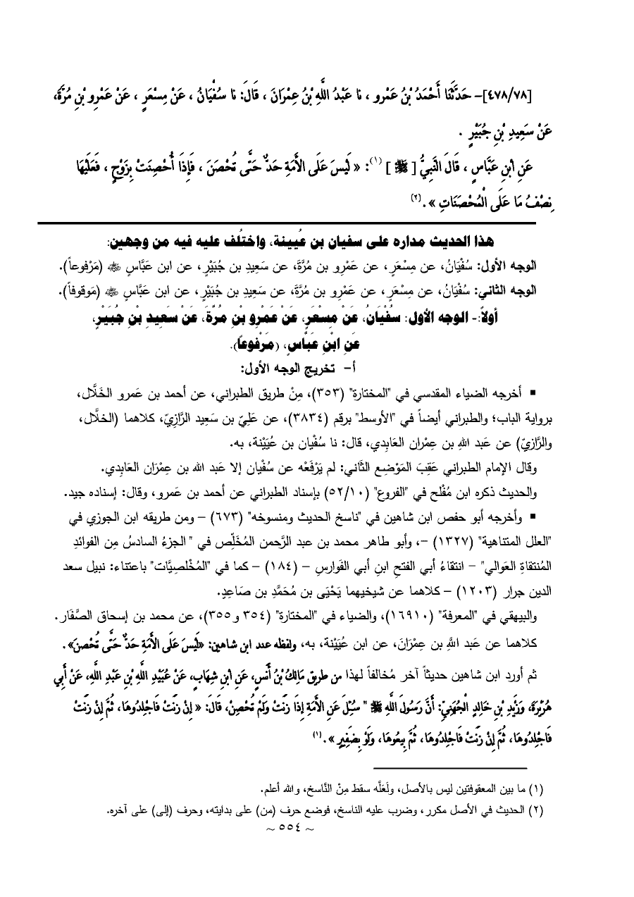 كلاهما عن عَبد اللَّهِ بن عِمْرَانَ، عن ابن عُيَيْنة، به، ولفظه عند ابن شاهين: «لَيْسَ عَلَى الأَمَةِ حَدٌّ حَتَّى تُحْصنَ».