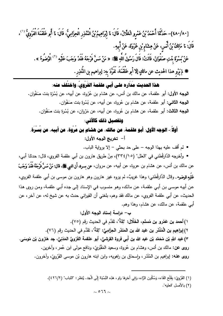 • وأخرجه الدَّارقُطني في "العلل" (١٥/ ٣٣٤)، مِنْ طريق هارون بن أبي علقمة الفروي، قال: حدثنا أبي، عن مالك بن أنس، عن هشام بن عروة، عن أبيه، عن مروان، عن بسرة، أن النبي - صلى الله عليه وسلم -، قال: مَنْ مَسَّ فَرْجَهُ فَقَدَ وَجَبَ عَلَيهِ الوضوء. وقال الدَّارقُطني: وهذا غريبٌ، لم يروه غير هارون وهو هارون بن موسى بن أبي علقمة الفروي، عن أبيه موسى بن أبي علقمة، عن مالك، وهو منسوب في الإسناد إلى جده أبي علقمة، ومن روى هذا الحديث، عن أبي علقمة الفروي، عن مالك فقد وهم، بلغني أن القيراني حدث به عن شيخ له، عن آخر، عن أبي علقمة، عن مالك، عن هشام، وهذا وهم.