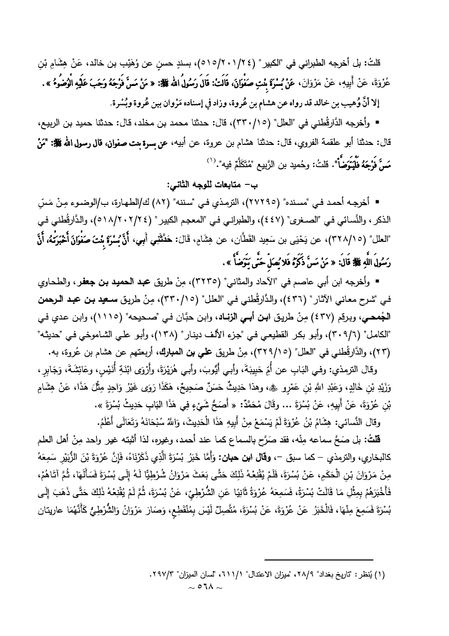 • وأخرجه الدَّارقُطني في "العلل" (١٥/ ٣٣٠)، قال: حدثنا محمد بن مخلد، قال: حدثنا حميد بن الربيع، قال: حدثنا أبو علقمة الفروي، قال: حدثنا هشام بن عروة، عن أبيه، عن بسرة بنت صفوان، قال رسول الله - صلى الله عليه وسلم -: "مَنْ مَسَّ فَرْجَهُ فَلْيَتَوَضَّأ". قلتُ: وحُميد بن الرَّبيع "مُتَكَلَّمٌ فيه". (¬١)