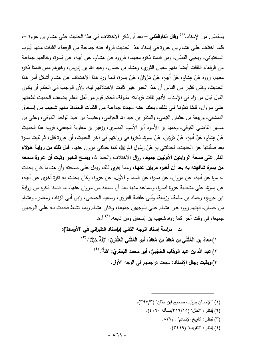وقال الدارقطني - بعد أن ذكر الاختلاف في هذا الحديث على هشام بن عروة -: فلما اختلف على هشام بن عروة في إسناد هذا الحديث فرواه عنه جماعة من الرفعاء الثقات منهم أيوب السختياني، ويحيى القطان، ومن قدمنا ذكره معهما؛ فرووه عن هشام، عن أبيه، عن بُسرة، وخالفهم جماعة من الرفعاء الثقات أيضا منهم سفيان الثوري، وهشام بن حسان، وعبد الله بن إدريس، وغيرهم ممن قدمنا ذكره معهم، رووه عَنْ هِشَامٍ، عَنْ أَبِيهِ، عَنْ مَرْوَانَ، عَنْ بسرة، فلما ورد هذا الاختلاف عن هشام أشكل أمر هذا الحديث، وظن كثير من الناس أن هذا الخبر غير ثابت لاختلافهم فيه، ولأن الواجب في الحكم أن يكون القول قول من زاد في الإسناد، لأنهم ثقات فزيادته مقبولة، فحكم قوم من أهل العلم بضعف الحديث لطعنهم على مروان، فلمَّا نظرنا في ذلك وبحثنا عنه وجدنا جماعة من الثقات الحفاظ منهم شعيب بن إسحاق الدمشقي، وربيعة بن عثمان التيمي، والمنذر بن عبد الله الحزامي، وعنبسة بن عبد الواحد الكوفي، وعلي بن مسهر القاضي الكوفي، وحميد بن الأسود أبو الأسود البصري، وزهير بن معاوية الجعفي، فرووا هذا الحديث عَنْ هِشَامٍ، عَنْ أَبِيهِ، عَنْ مَرْوَانَ، عَنْ بسرة، ذكروا في روايتهم في آخر الحديث، أن عروة قال: ثم لقيت بسرة بعد فسألتها عن الحديث، فحدثتني بِهِ عَنْ رَسُولِ اللَّهِ - صلى الله عليه وسلم -، كما حدثني مروان عنها، فدل ذلك من رواية هؤلاء النفر على صحة الروايتين الأوليين جميعا، وزال الاختلاف والحمد لله، وصح الخبر وثبت أن عروة سمعه من بسرة شافهته به بعد أن أخبره مروان عنها، ومما يقوي ذلك ويدل على صحته وأن هشاما كان يحدث به مرة عن أبيه، عن مروان، عن بسرة، عن السماع الأول، عن عروة، وكان يحدث به تارة أخرى عن أبيه، عن بسرة، على مشافهة عروة لبسرة، وسماعه منها بعد أن سمعه من مروان عنها، ما قدمنا ذكره من رواية ابن جريج، وحماد بن سلمة، وزمعة، وأبي علقمة