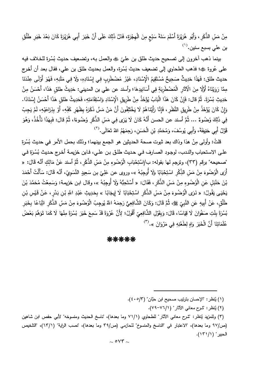 مِنْ مَسِّ الذَّكَرِ، وَأَبُو هُرَيْرَةَ أَسْلَمَ سَنَةَ سَبْعٍ مِنَ الْهِجْرَةِ، فَدَلَّ ذَلِكَ عَلَى أَنَّ خَبَرَ أَبِي هُرَيْرَةَ كَانَ بَعْدَ خَبَرِ طَلْقِ بن علي بسبع سنين. (¬١)