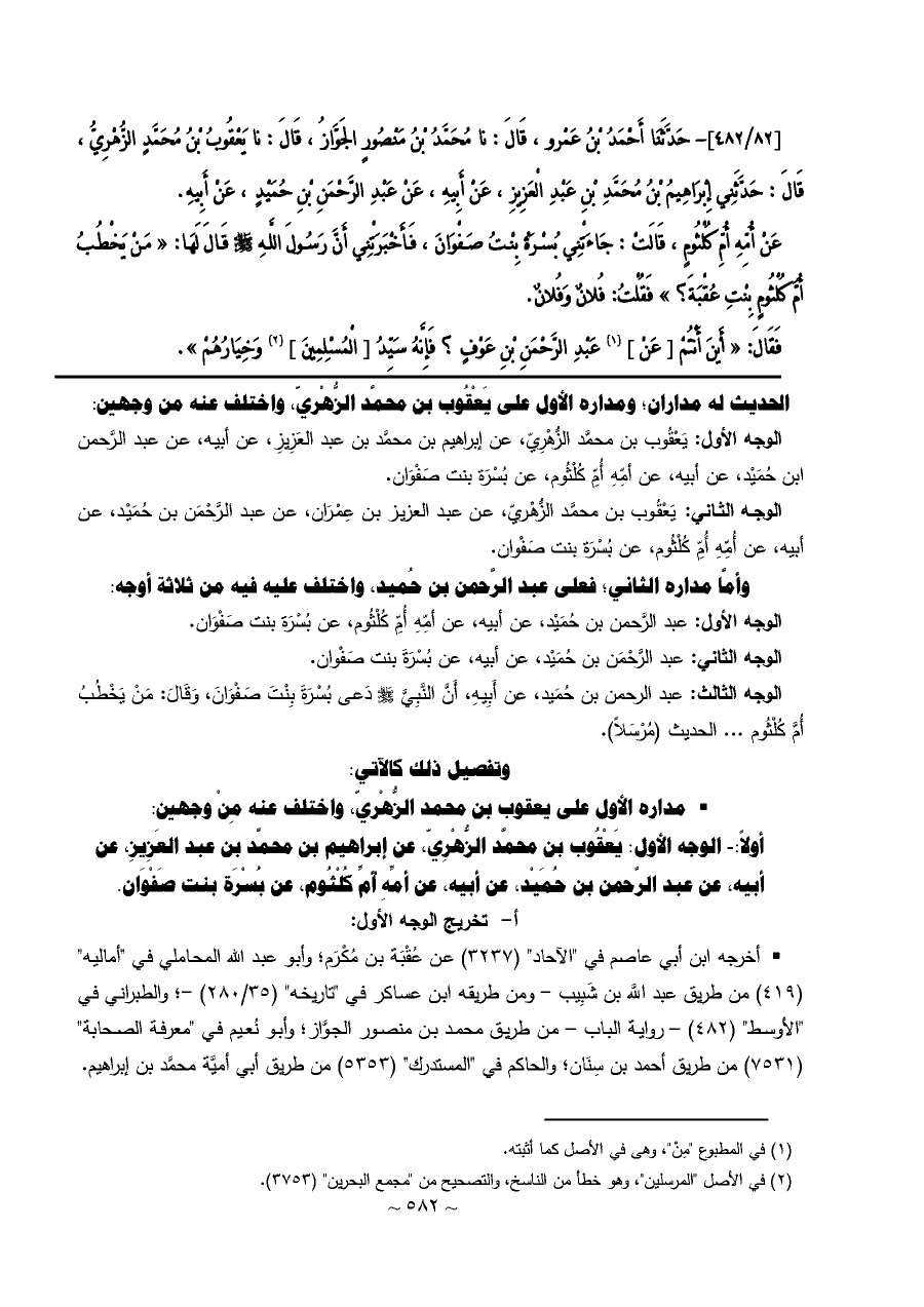 الوجه الأول: يَعْقُوب بن محمَّد الزُّهْرِيّ، عن إبراهيم بن محمَّد بن عبد العَزِيزِ، عن أبيه، عن عبد الرَّحمن ابن حُمَيْد، عن أبيه، عن أمِّهِ أُمِّ كُلْثُوم، عن بُسْرَة بنت صَفْوَان.
