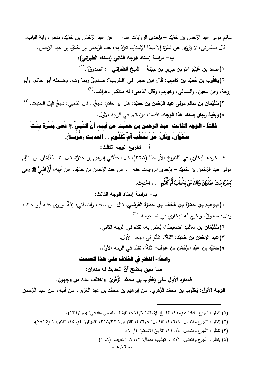 ثالثاً: - الوجه الثالث: عبد الرحمن بن حُمَيد، عن أَبِيهِ، أَنَّ النَّبِيَّ - صلى الله عليه وسلم - دَعى بُسْرَةَ بِنْتَ صَفْوَانَ، وَقَالَ: مَنْ يَخْطُبُ أُمَّ كُلْثُوم ... الحديث (مُرْسَلاً).
