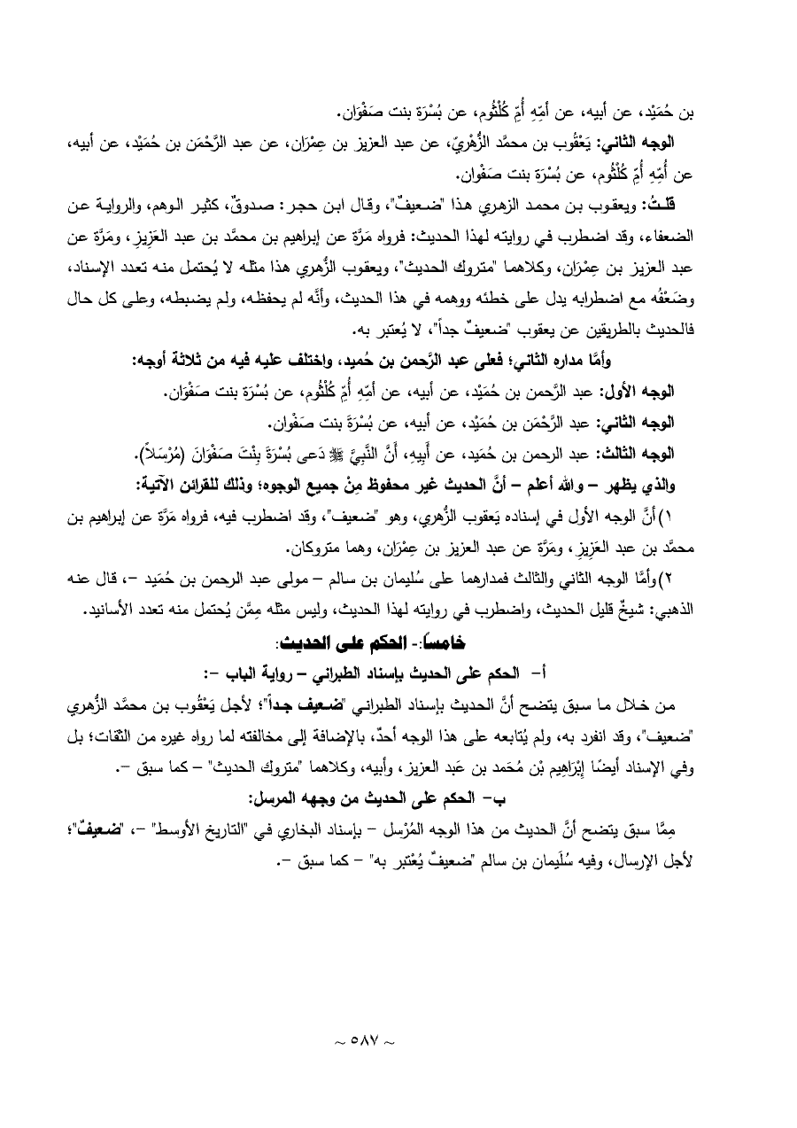 الوجه الثاني: يَعْقُوب بن محمَّد الزُّهْريّ، عن عبد العزيز بن عِمْرَان، عن عبد الرَّحْمَن بن حُمَيْد، عن أبيه، عن أُمِّهِ أُمِّ كُلْثُوم، عن بُسْرَة بنت صَفْوان.