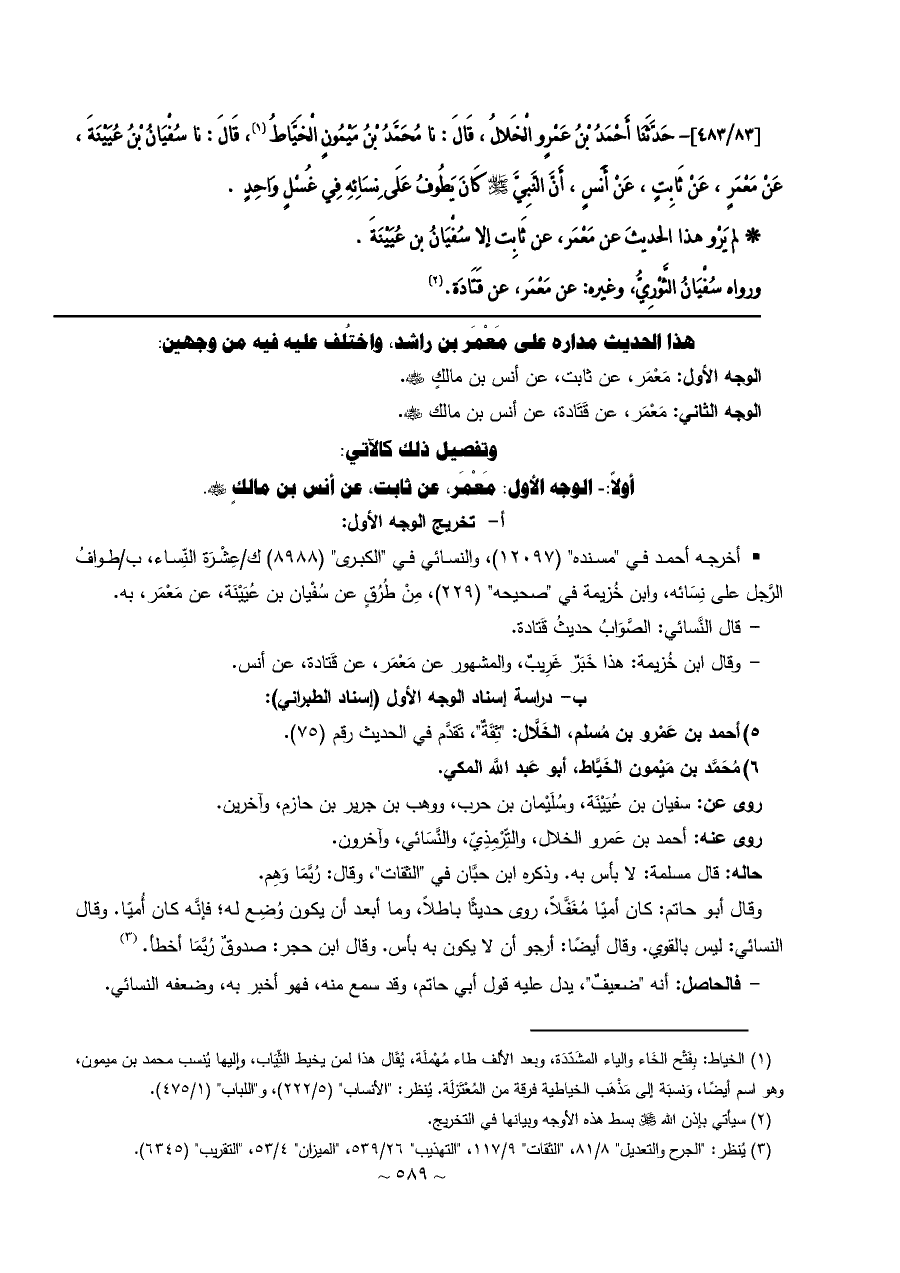 [٨٣/ ٤٨٣]- حَدَّثَنَا أَحْمَدُ بْنُ عَمْرٍو الْخَلالُ، قَالَ: نا مُحَمَّدُ بْنُ مَيْمُونٍ الْخَيَّاطُ (¬١)، قَالَ: نا سُفْيَانُ بْنُ عُيَيْنَةَ، عَنْ مَعْمَرٍ، عَنْ ثَابِتٍ، عَنْ أَنَسٍ، أَنَّ النَّبِيَّ - صلى الله عليه وسلم - كَانَ يَطُوفُ عَلَى نِسَائِهِ فِي غُسْلٍ وَاحِدٍ.