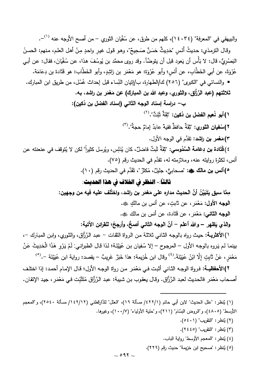 ١) الأكثرية: حيث رواه بالوجه الثاني ثلاثة من الرواة الثقات - عبد الرَّزَّاق، والثوري، وابن المبارك -، بينما لم يَروه بالوجه الأول - المرجوح - إلا سُفيان بن عُيَيْنَة؛ لذا قال الطبراني: لَمْ يَرْوِ هَذَا الْحَدِيثَ عَنْ مَعْمَرٍ، عَنْ ثَابِتٍ إِلَّا ابْنُ عُيَيْنَةَ. (¬٤) وقال ابن خُزيمة: هذا خَبَرٌ غَرِيبٌ - يقصد: رواية ابن عُيَيْنَة -. (¬٥)