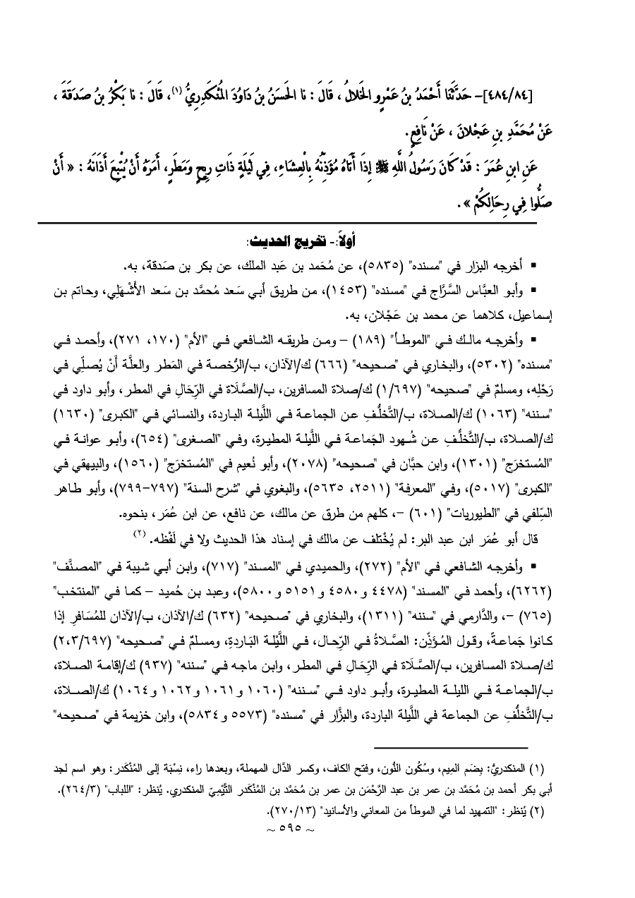 [٨٤/ ٤٨٤]- حَدَّثَنَا أَحْمَدُ بنُ عَمْرٍو الخَلالُ، قَالَ: نا الحَسَنُ بنُ دَاوُدَ المُنْكَدِرِيُّ (¬١)، قَالَ: نا بَكْرُ بنُ صَدَقَةَ، عَنْ مُحَمَّدِ بنِ عَجْلانَ، عَنْ نَافِعٍ.
