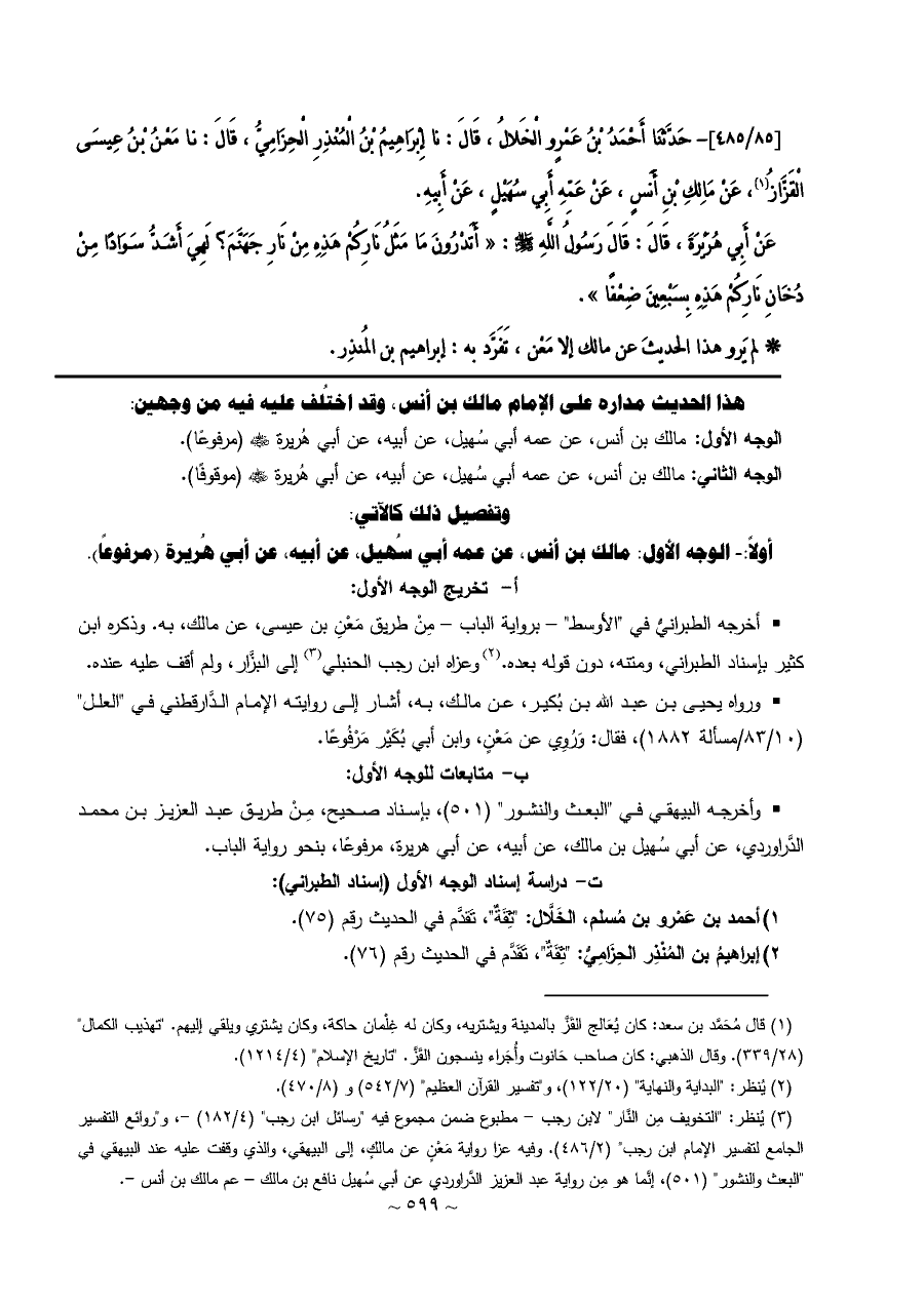 (¬٣) يُنظر: "التخويف مِن النَّار" لابن رجب - مطبوع ضمن مجموع فيه "رسائل ابن رجب" (٤/ ١٨٢) -، و"روائع التفسير الجامع لتفسير الإمام ابن رجب" (٢/ ٤٨٦). وفيه عزا رواية مَعْنٍ عن مالكٍ، إلى البيهقي، والذي وقفت عليه عند البيهقي في "البعث والنشور" (٥٠١)، إنَّما هو مِن رواية عبد العزيز الدَّراوردي عن أبي سُهيل نافع بن مالك - عم مالك بن أنس -.