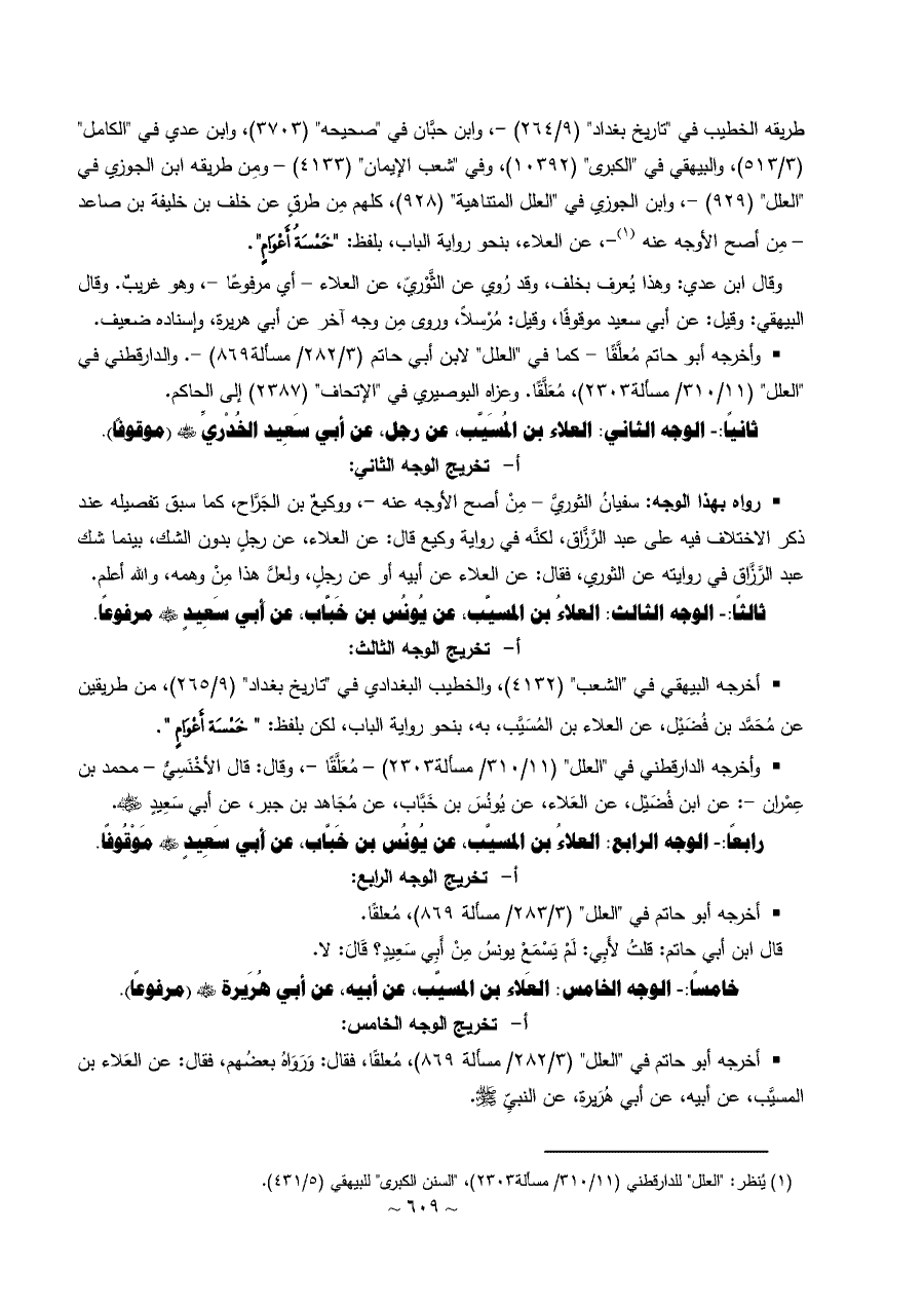 وقال ابن عدي: وهذا يُعرف بخلف، وقد رُوي عن الثَّوْريّ، عن العلاء - أي مرفوعًا -، وهو غريبٌ. وقال البيهقي: وقيل: عن أبي سعيد موقوفًا، وقيل: مُرْسلاً، وروى مِن وجه آخر عن أبي هريرة، وإسناده ضعيف.