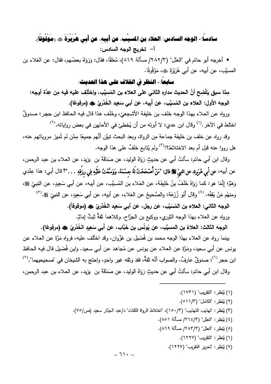 وقال ابن أبي حاتم: سألتُ أبي عن حديثٍ رَوَاهُ الوليد، عن صَدَقَةَ بن يزيد، عن العلاء بن عبد الرحمن، عن أبيه، عن أبي هُرَيرة، عن النبيِّ - صلى الله عليه وسلم - قال: "مَنْ أَصْحَحْتُ لَهُ جِسْمَهُ، وَوَسَّعْتُ عَلَيْهِ فِي رِزْقِهِ ... "؟ قال أبي: هذا عِنْدِي وَهَمٌ؛ إِنَّمَا هو: كما رَوَاهُ خَلَفُ بنُ خَلِيفَة، عن العَلاء بن المُسيَّب، عن أبيه، عن أبي سَعِيدٍ، عن النبيِّ - صلى الله عليه وسلم -، ومنهُم مَنْ يَقِفُه. (¬٤) وقال أَبُو زُرْعَة: والصَّحيحُ عن العَلاءِ، عن أبيه، عن أبي سَعِيدٍ، عن النبيِّ - صلى الله عليه وسلم -. (¬٥)