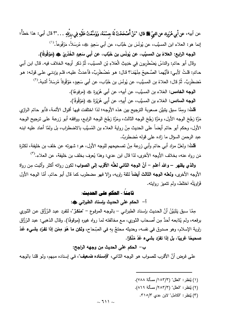 قلتُ: ولعلَّ مراد أبي حاتم وأبي زرعة مِنْ تصحيحهم للوجه الأول، هو: شهرته عن خلف بن خليفة، لكثرة مَن رواه عنه، بخلاف الأوجه الأخرى، لذا قال ابن عدي: وهذا يُعرف بخلف بن خليفة، عن العلاء. (¬٣)