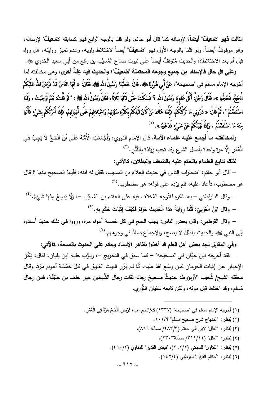 وعلى كل حال فالإسناد مِن جميع وجوهه المحتملة "ضعيفٌ"؛ والحديث فيه عِلةٌ أخرى، وهى مخالفته لما أخرجه الإمام مسلم في "صحيحه"، عَنْ أَبِي هُرَيْرَةَ - رضي الله عنه -، قَالَ: خَطَبَنَا رَسُولُ اللهِ - صلى الله عليه وسلم -، فَقَالَ: «أَيُّهَا النَّاسُ قَدْ فَرَضَ اللهُ عَلَيْكُمُ الْحَجَّ، فَحُجُّوا»، فَقَالَ رَجُلٌ: أَكُلَّ عَامٍ يَا رَسُولَ اللهِ؟ فَسَكَتَ حَتَّى قَالَهَا ثَلاثًا، فَقَالَ رَسُولُ اللهِ - صلى الله عليه وسلم -: " لَوْ قُلْتُ: نَعَمْ لَوَجَبَتْ، وَلَمَا اسْتَطَعْتُمْ "، ثُمَّ قَالَ: «ذَرُونِي مَا تَرَكْتُكُمْ، فَإِنَّمَا هَلَكَ مَنْ كَانَ قَبْلَكُمْ بِكَثْرَةِ سُؤَالِهِمْ وَاخْتِلافِهِمْ عَلَى أَنْبِيَائِهِمْ، فَإِذَا أَمَرْتُكُمْ بِشَيْءٍ فَأْتُوا مِنْهُ مَا اسْتَطَعْتُمْ، وَإِذَا نَهَيْتُكُمْ عَنْ شَيْءٍ فَدَعُوهُ». (¬١)