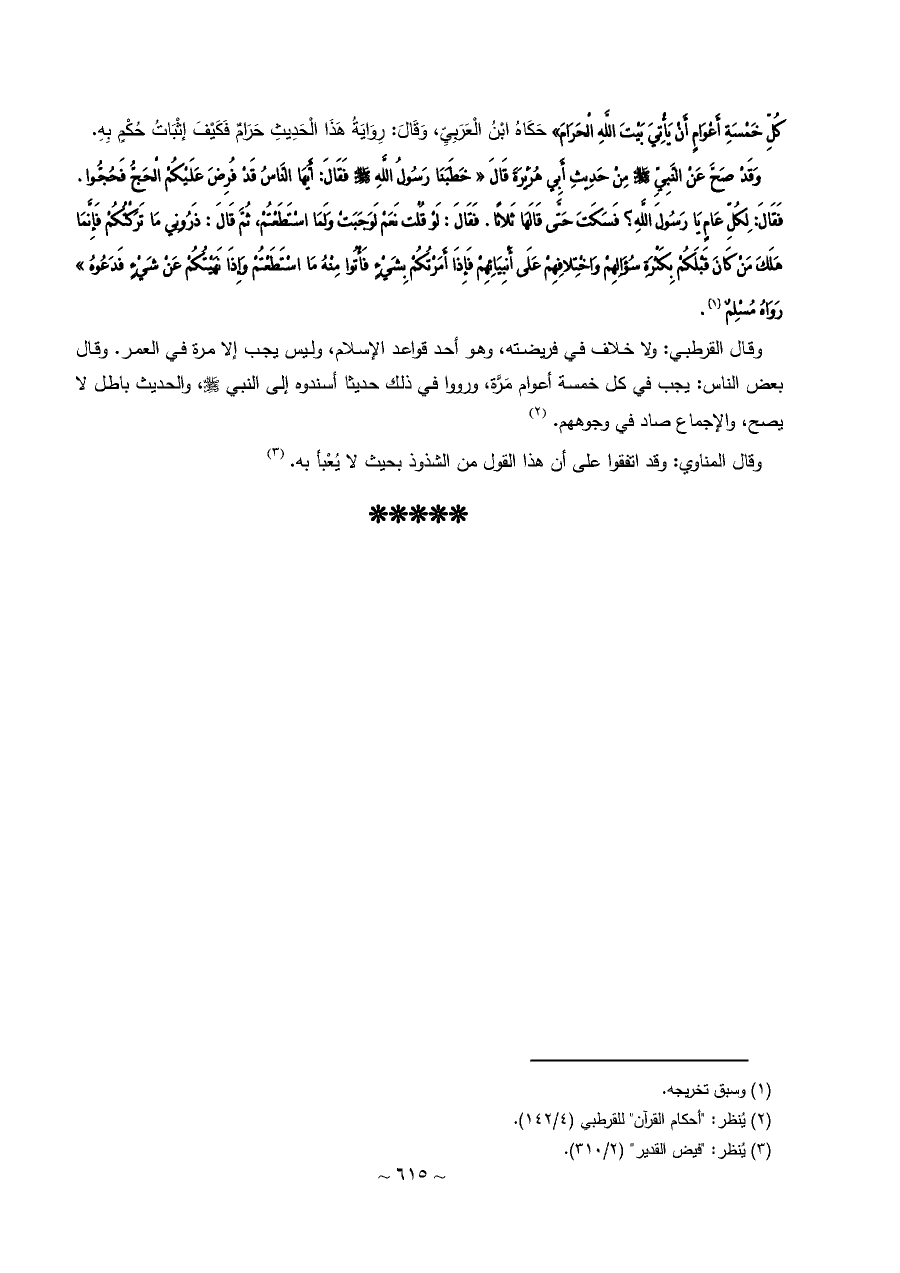 كُلِّ خَمْسَةِ أَعْوَامٍ أَنْ يَأْتِيَ بَيْتَ اللَّهِ الْحَرَامَ» حَكَاهُ ابْنُ الْعَرَبِيِّ، وَقَالَ: رِوَايَةُ هَذَا الْحَدِيثِ حَرَامٌ فَكَيْفَ إثْبَاتُ حُكْمٍ بِهِ.