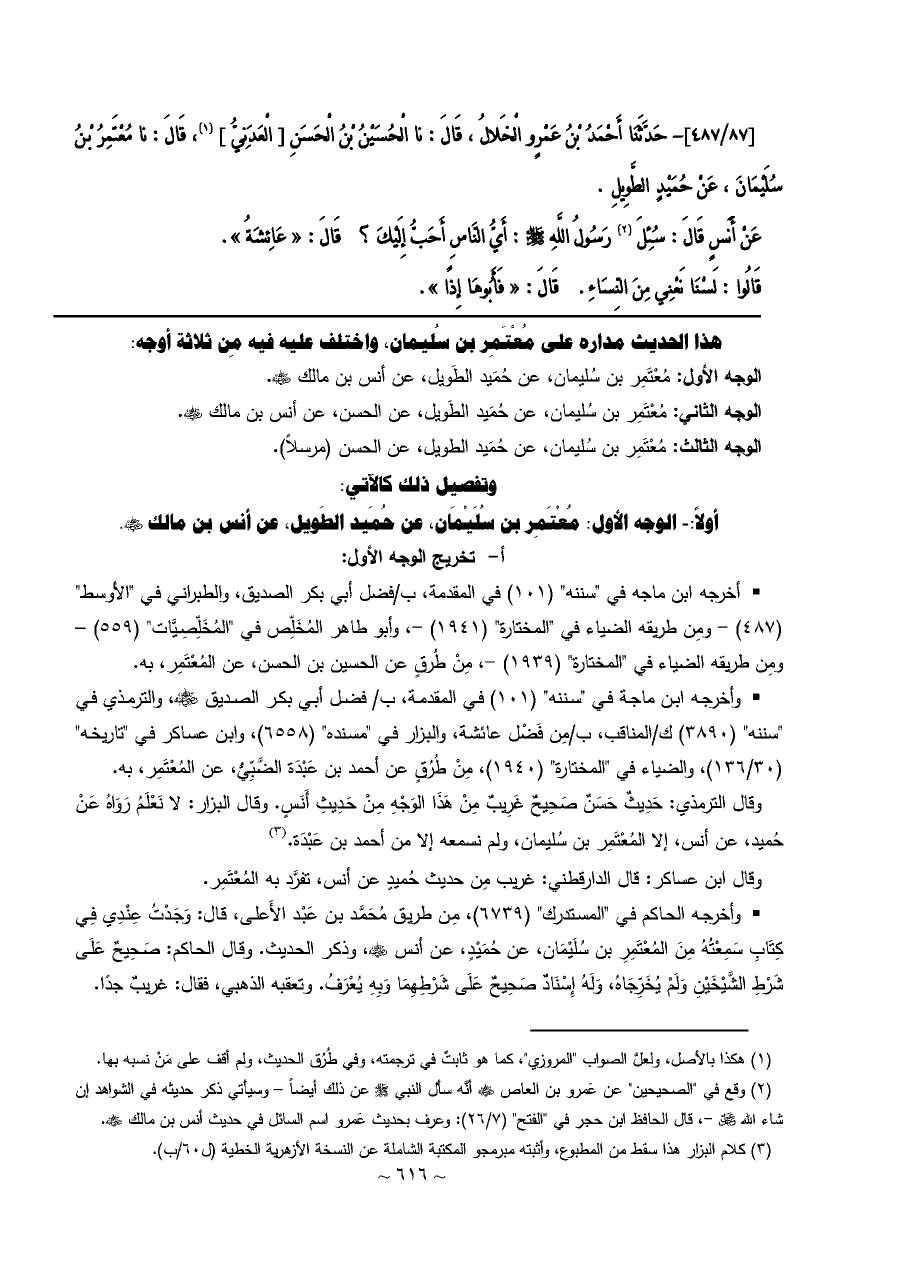[٨٧/ ٤٨٧]- حَدَّثَنَا أَحْمَدُ بْنُ عَمْرٍو الْخَلالُ، قَالَ: نا الْحُسَيْنُ بْنُ الْحَسَنِ [الْعَدَنِيُّ] (¬١)، قَالَ: نا مُعْتَمِرُ بْنُ سُلَيْمَانَ، عَنْ حُمَيْدٍ الطَّوِيلِ.
